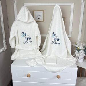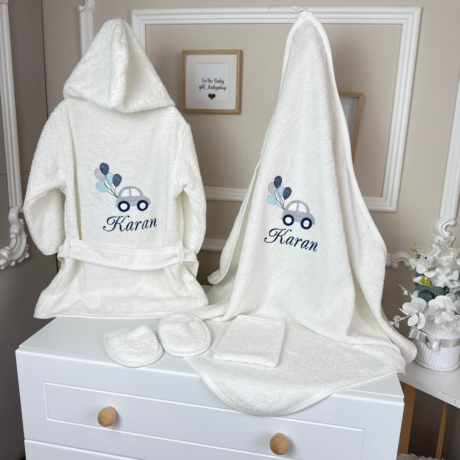 Bebek Bornoz Seti, banyo sonrası bebeğinizi yumuşak dokusuyla sararak sıcak ve konforlu bir kullanım sunar.