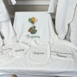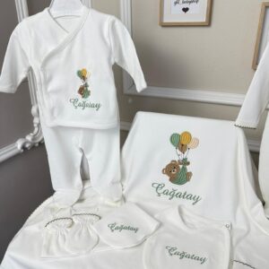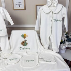 Hastane Çıkışı Seti, bebeğinizin ilk günlerinde ihtiyaç duyduğu parçaları bir araya getirir. Konforlu, şık ve kullanıma hazırdır.