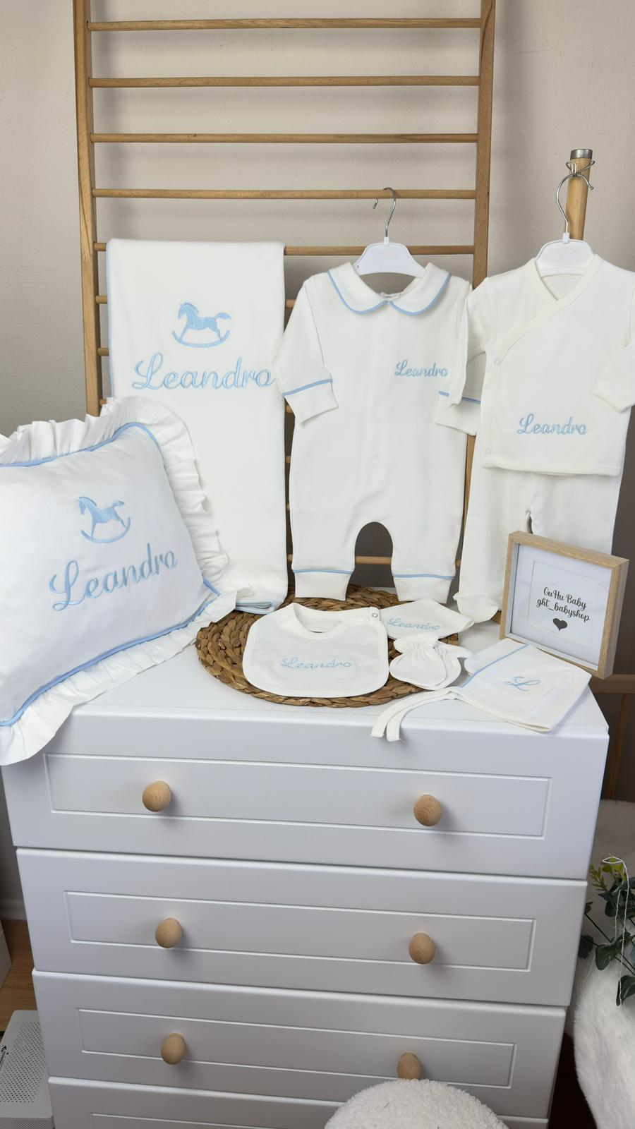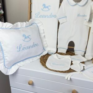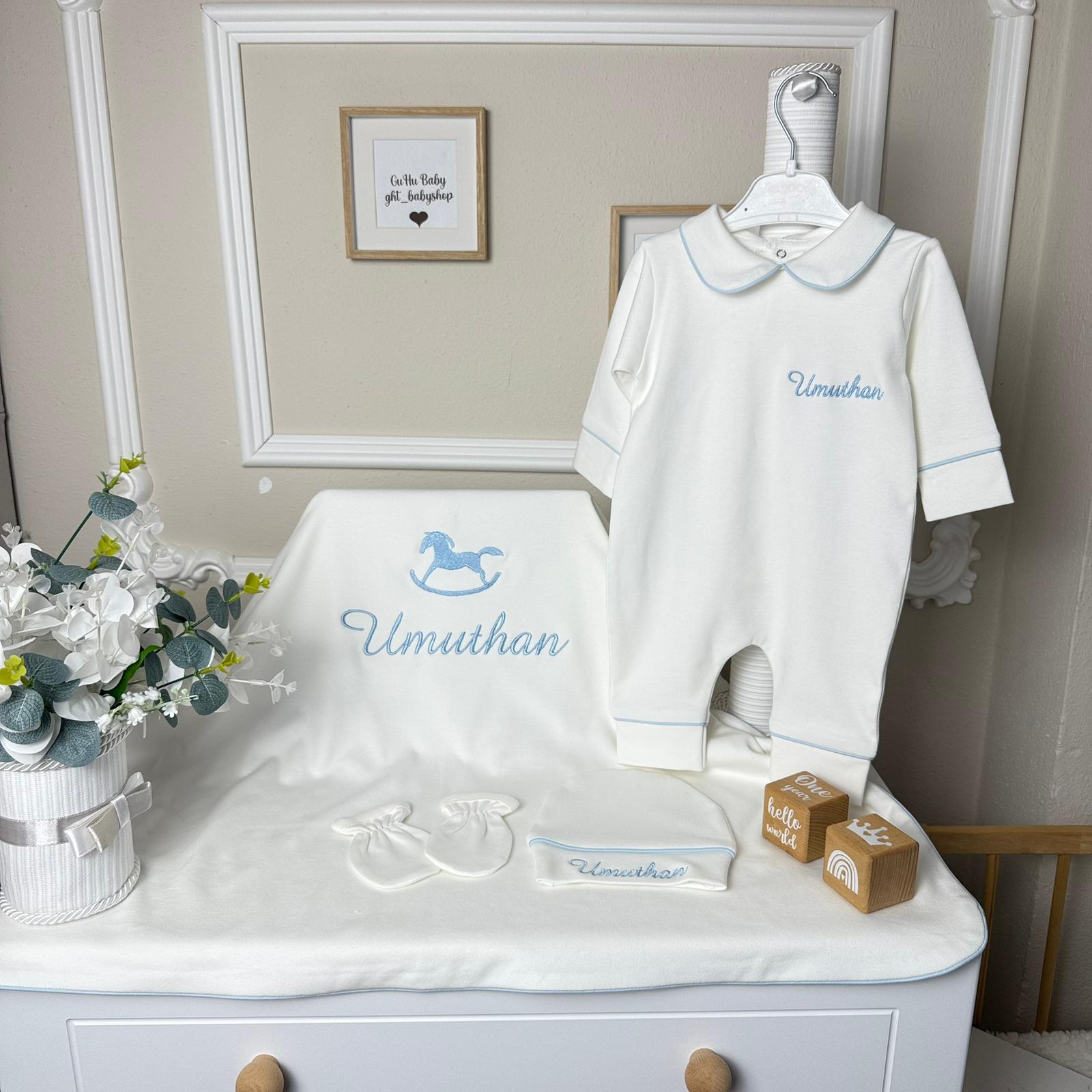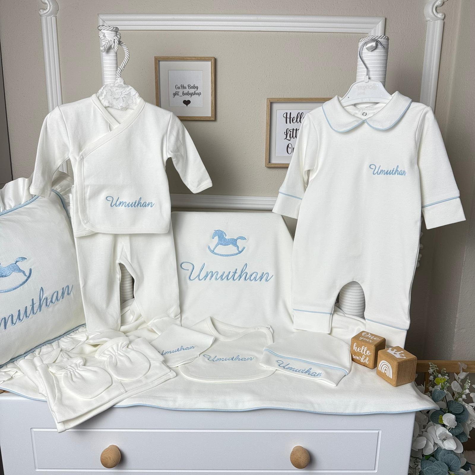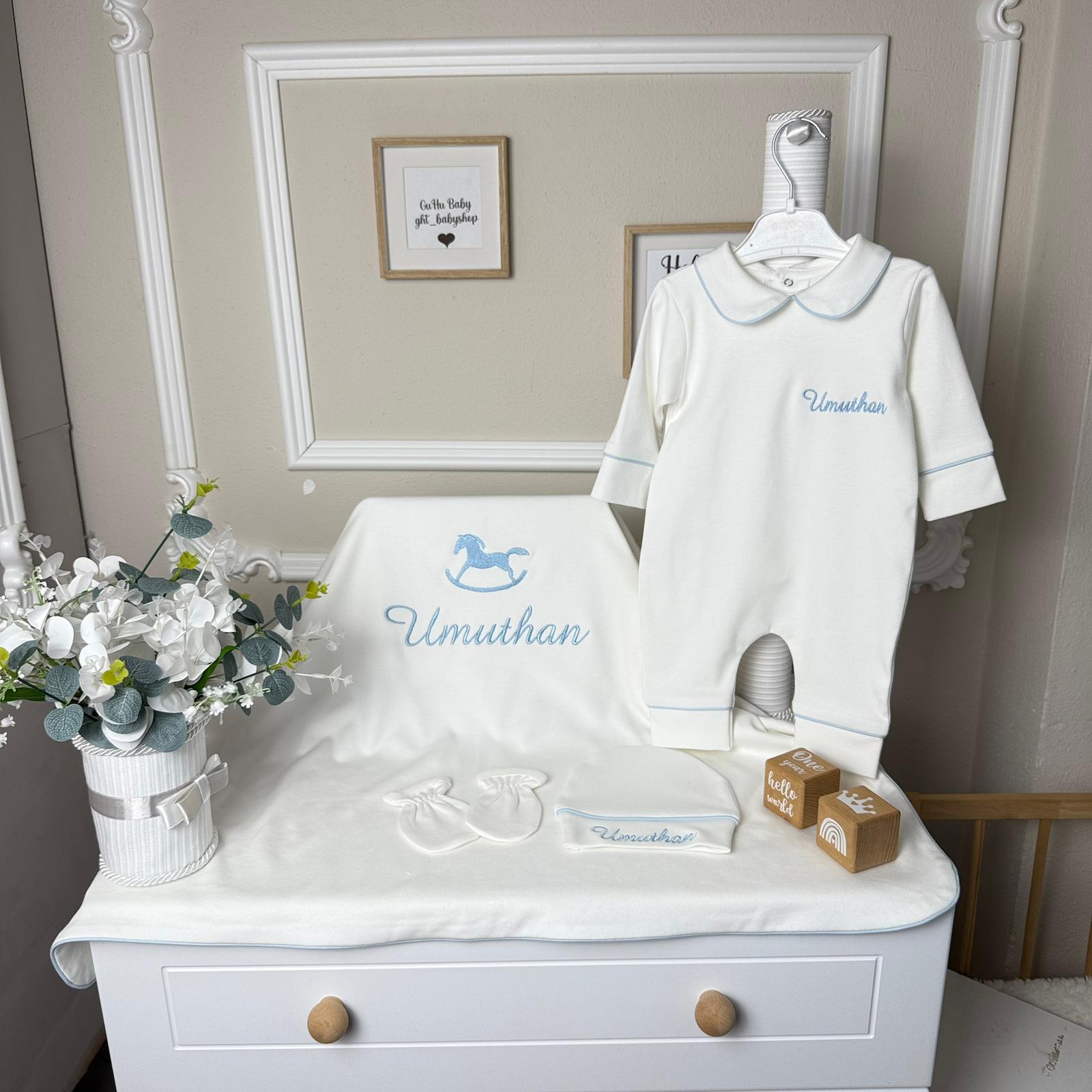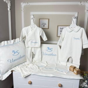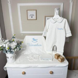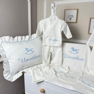 Hastane Çıkışı Seti, bebeğinizin ilk günlerinde ihtiyaç duyduğu parçaları bir araya getirir. Konforlu, şık ve kullanıma hazırdır.