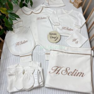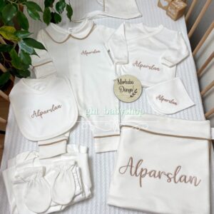 Hastane Çıkışı Seti, bebeğinizin ilk günlerinde ihtiyaç duyduğu parçaları bir araya getirir. Konforlu, şık ve kullanıma hazırdır.