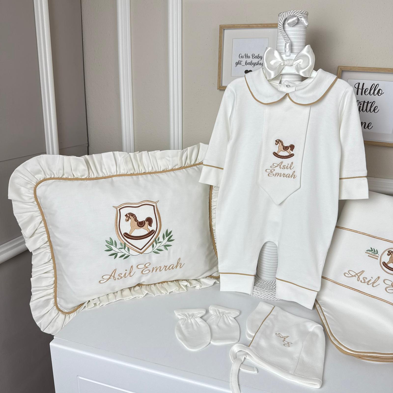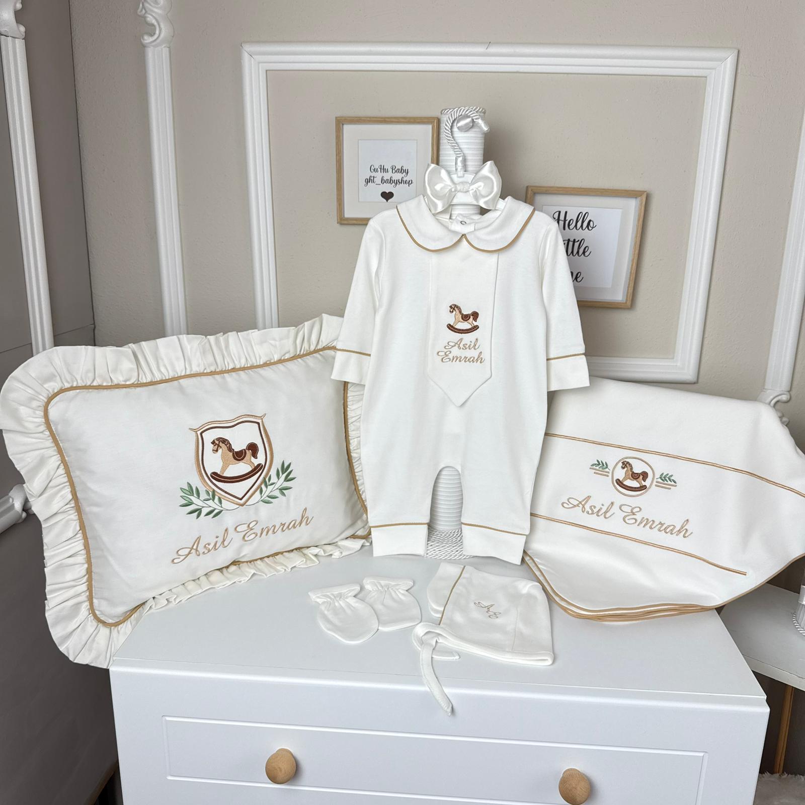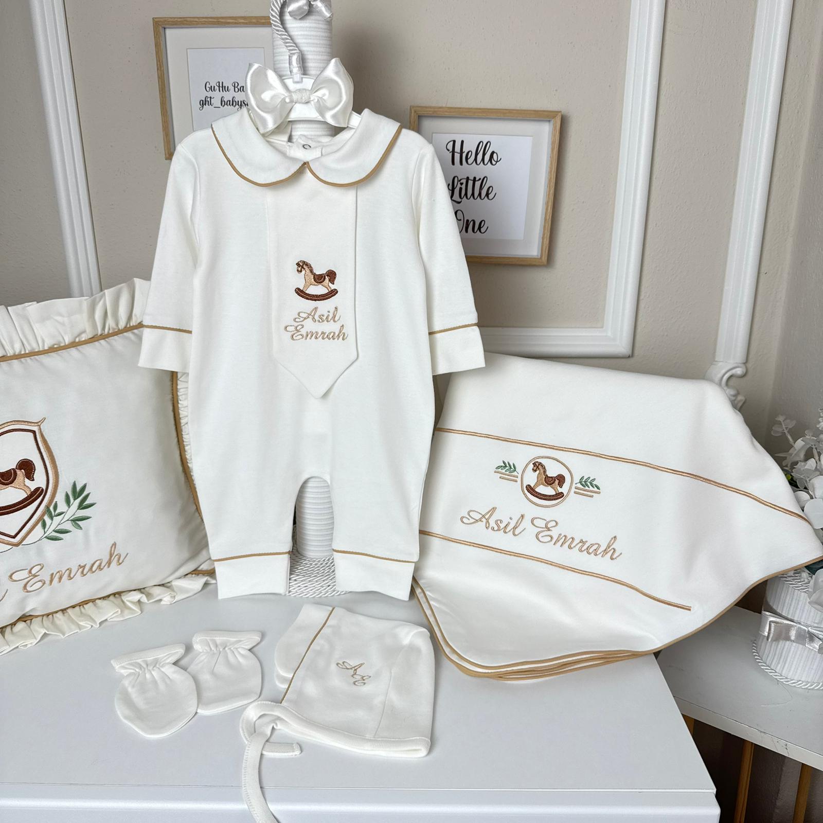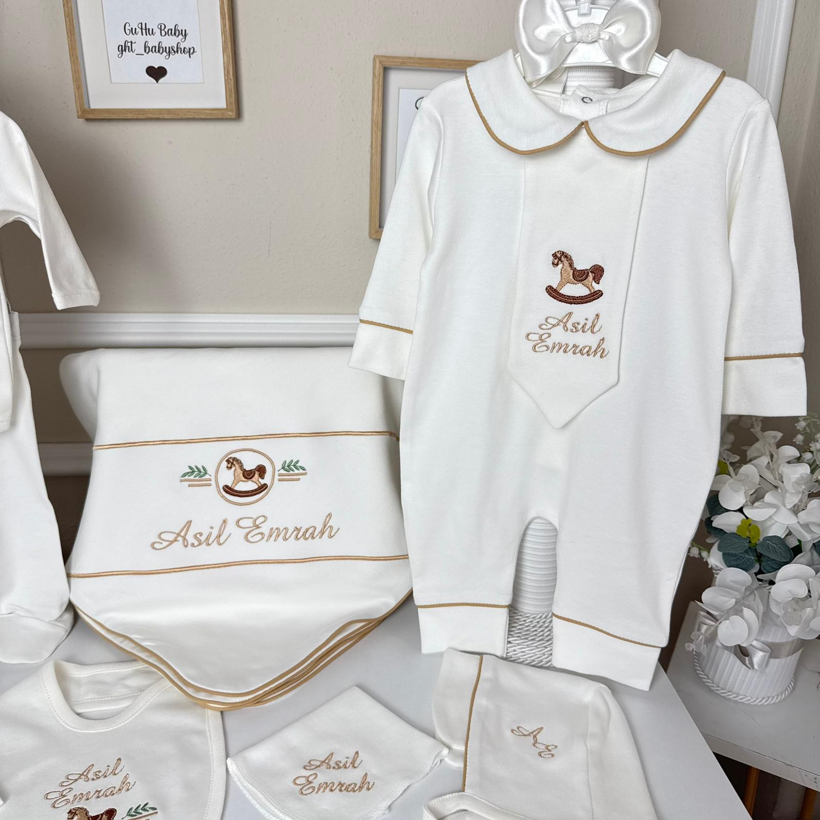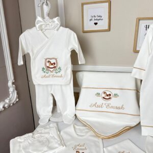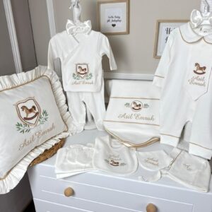 Hastane Çıkışı Seti, bebeğinizin ilk günlerinde ihtiyaç duyduğu parçaları bir araya getirir. Konforlu, şık ve kullanıma hazırdır.