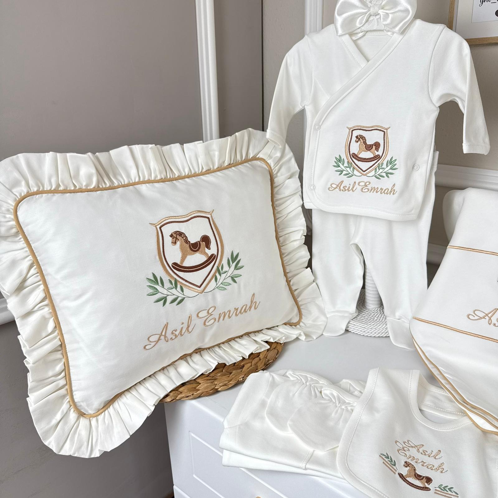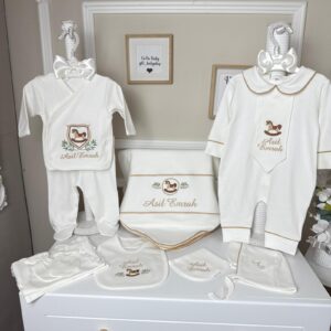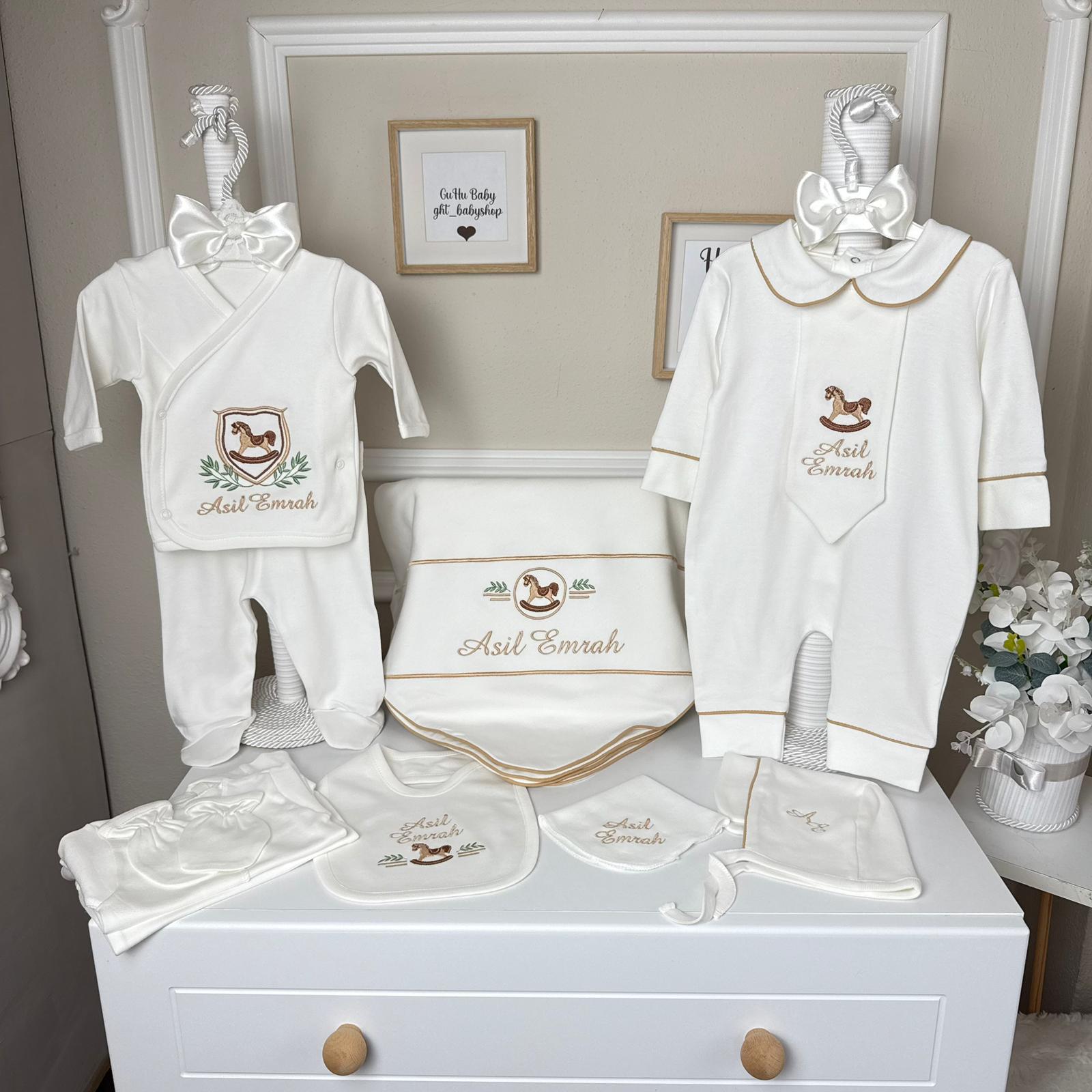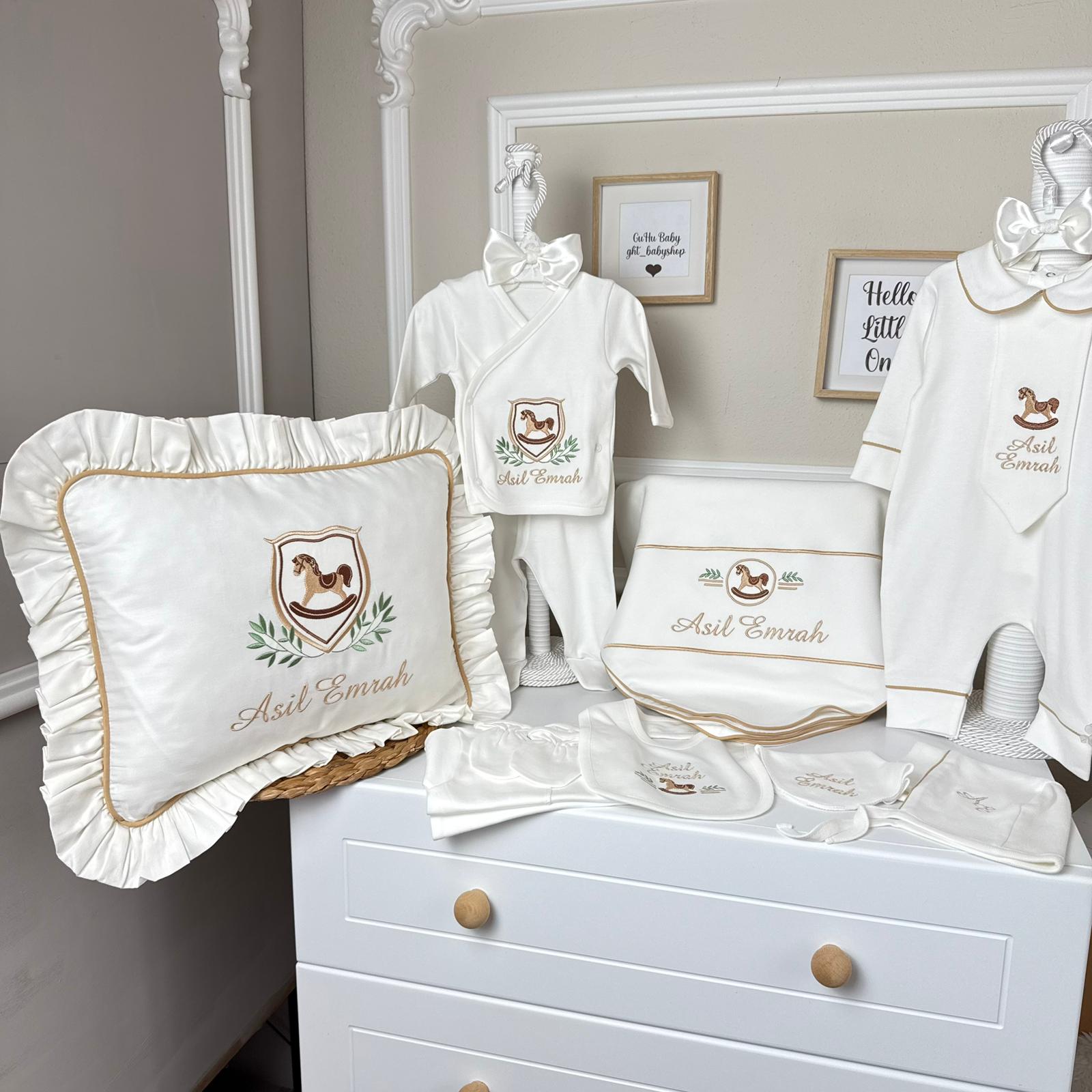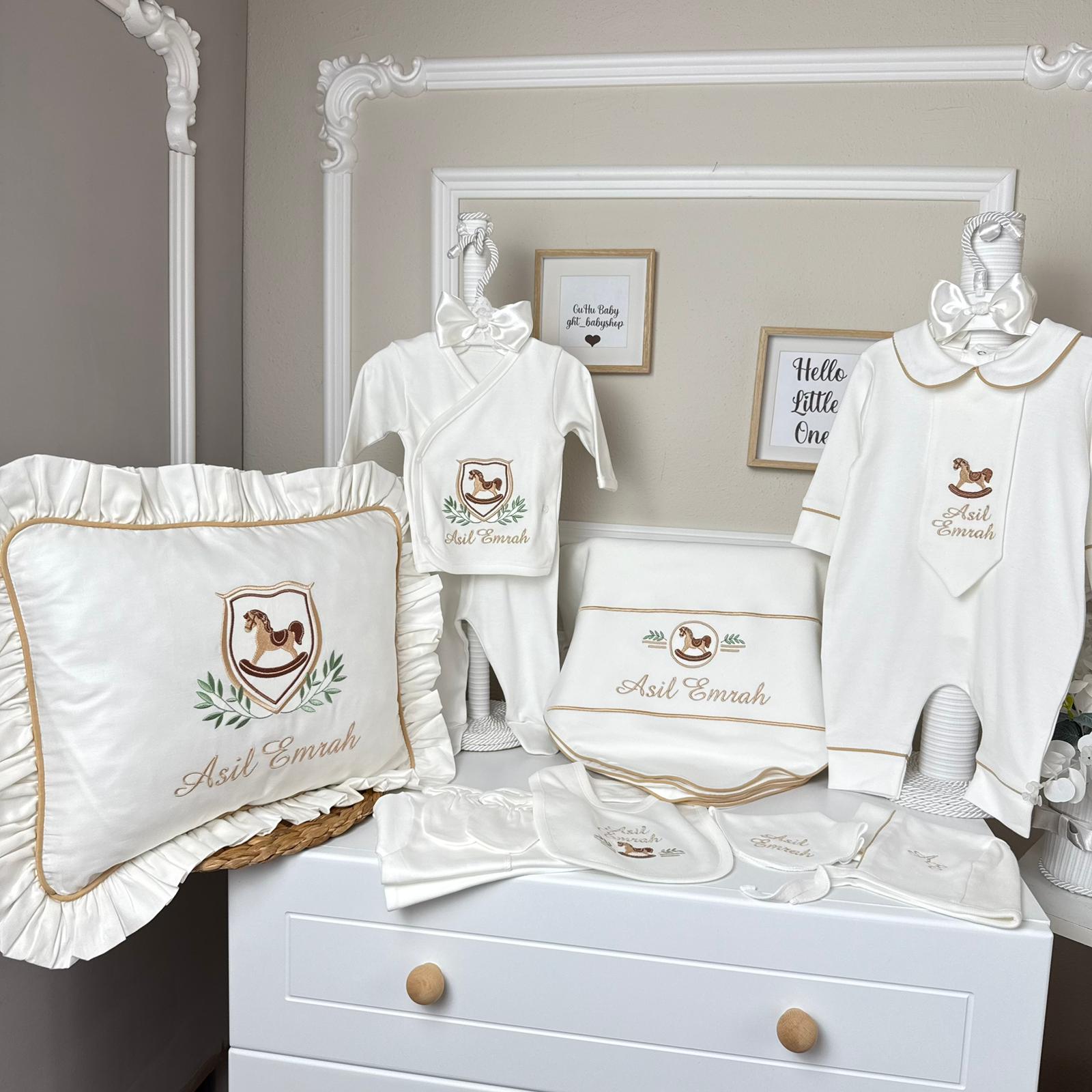 Hastane Çıkışı Seti, bebeğinizin ilk günlerinde ihtiyaç duyduğu parçaları bir araya getirir. Konforlu, şık ve kullanıma hazırdır.