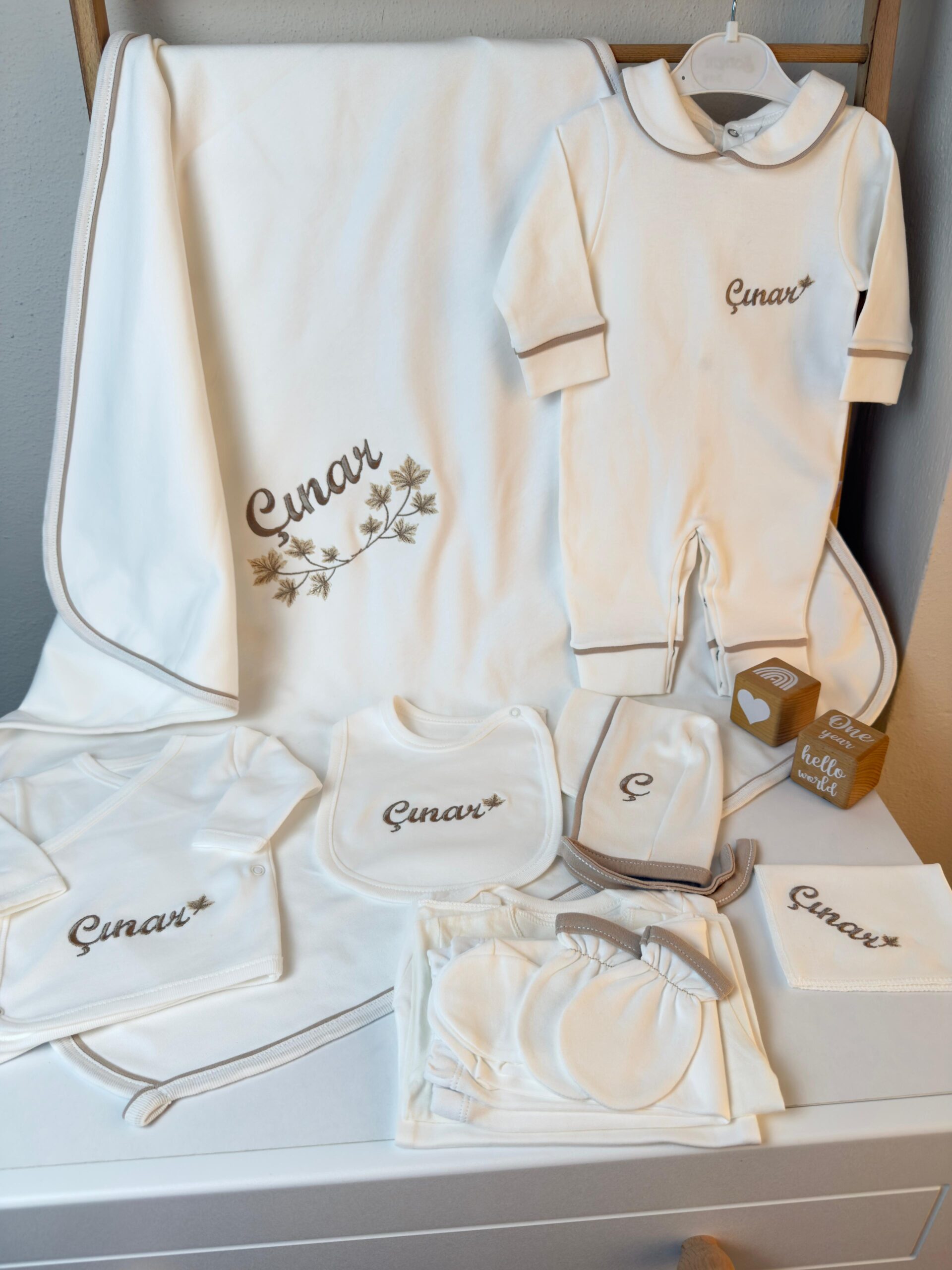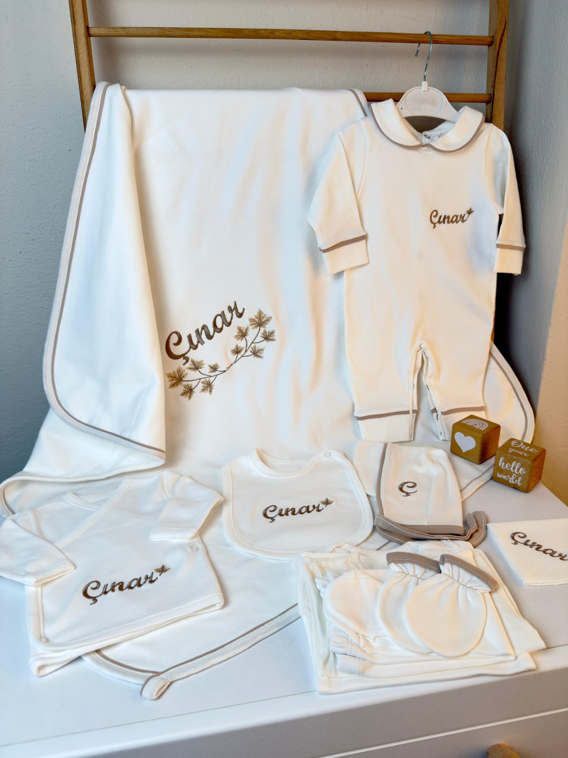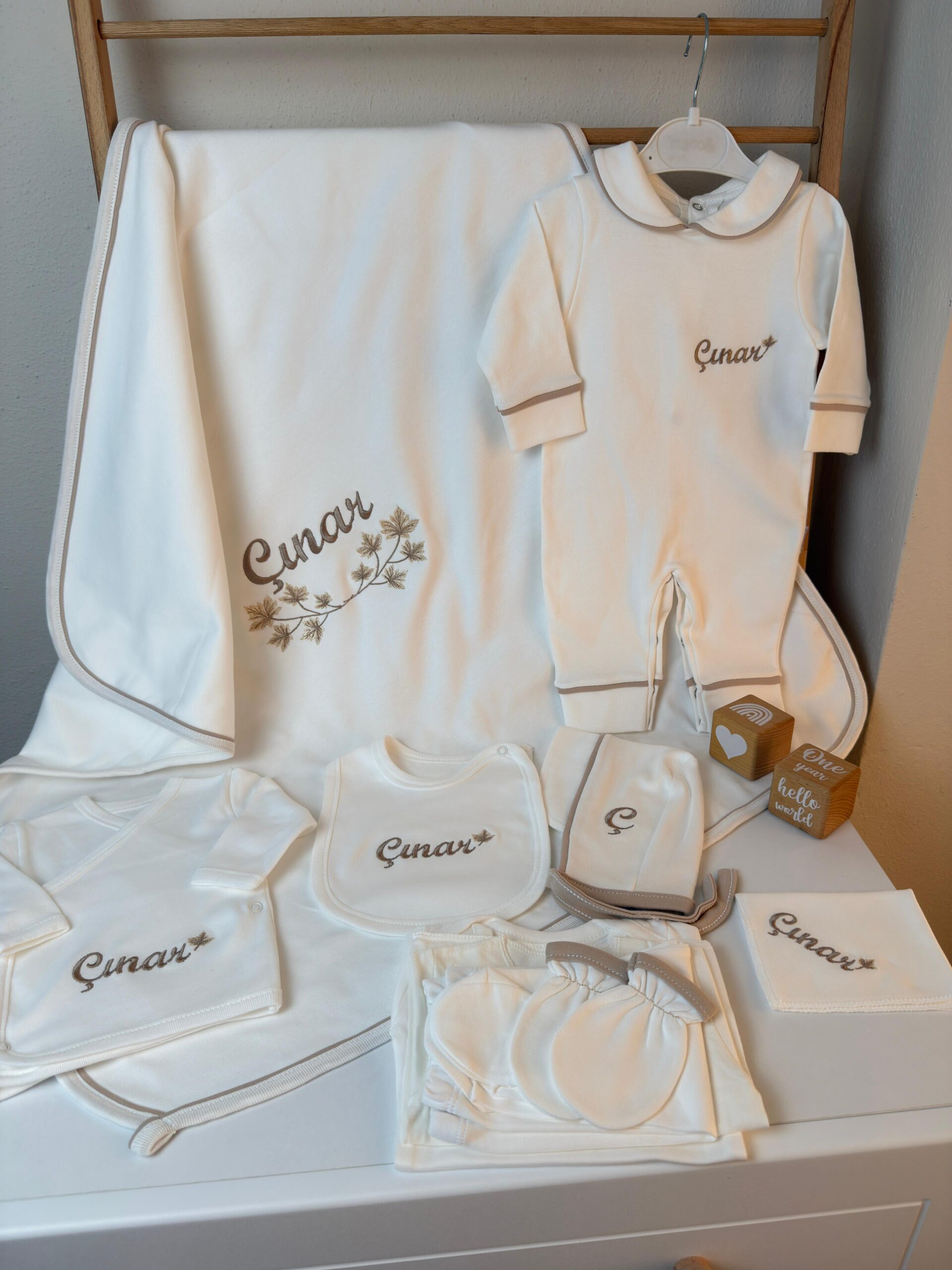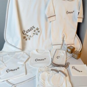 Hastane Çıkışı Seti, bebeğinizin ilk günlerinde ihtiyaç duyduğu parçaları bir araya getirir. Konforlu, şık ve kullanıma hazırdır.