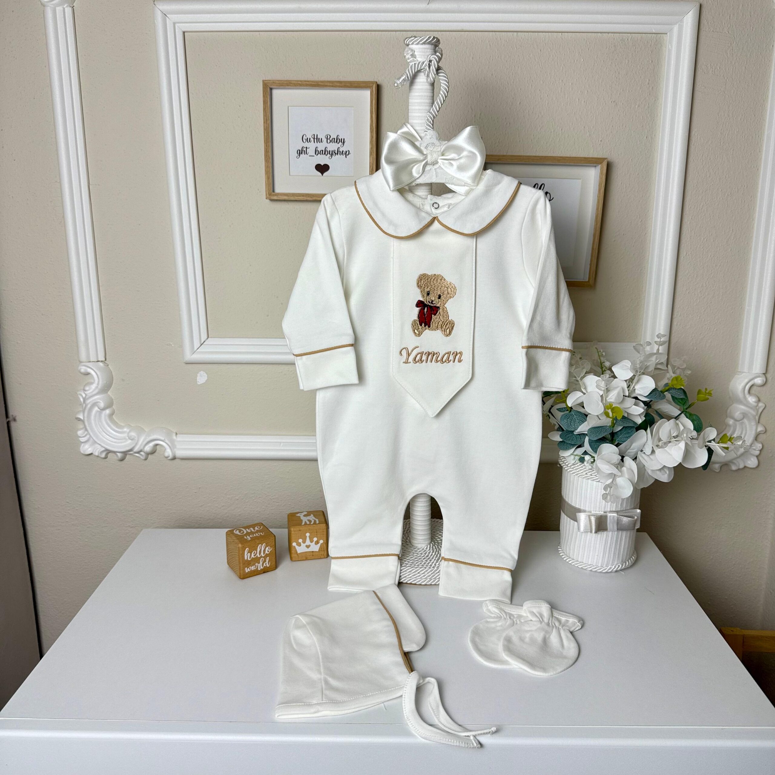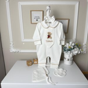 Hastane Çıkışı Seti, bebeğinizin ilk günlerinde ihtiyaç duyduğu parçaları bir araya getirir. Konforlu, şık ve kullanıma hazırdır.