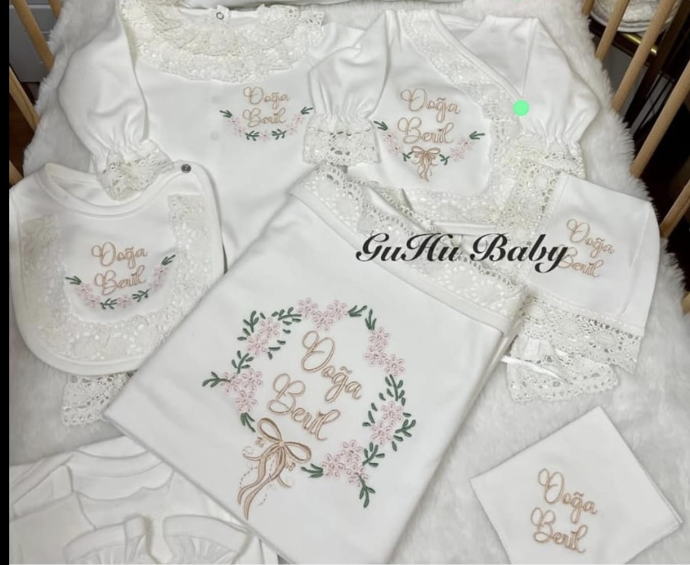Hastane Çıkışı Seti, bebeğinizin ilk günlerinde ihtiyaç duyduğu parçaları bir araya getirir. Konforlu, şık ve kullanıma hazırdır.