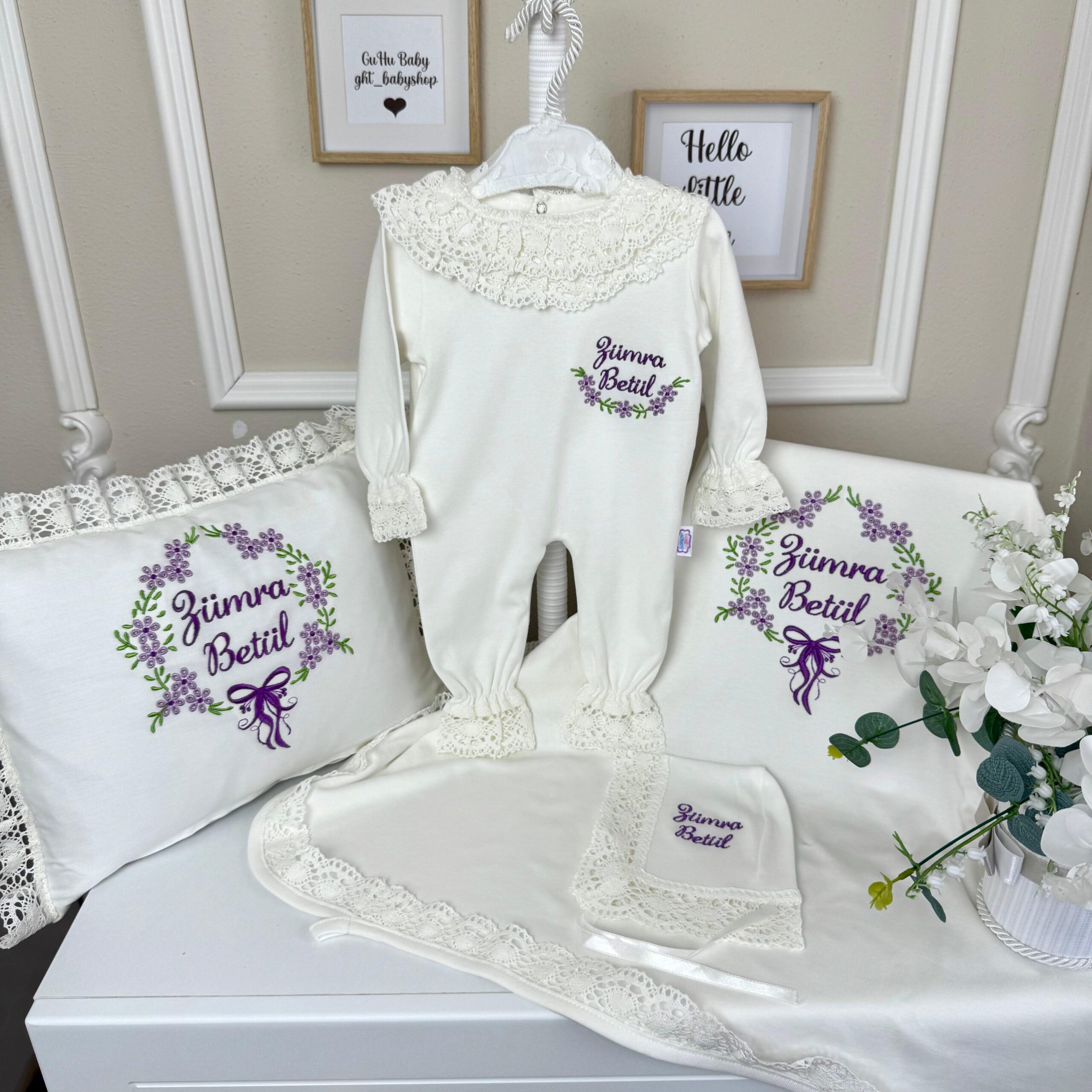 Hastane Çıkışı Seti, bebeğinizin ilk günlerinde ihtiyaç duyduğu parçaları bir araya getirir. Konforlu, şık ve kullanıma hazırdır.