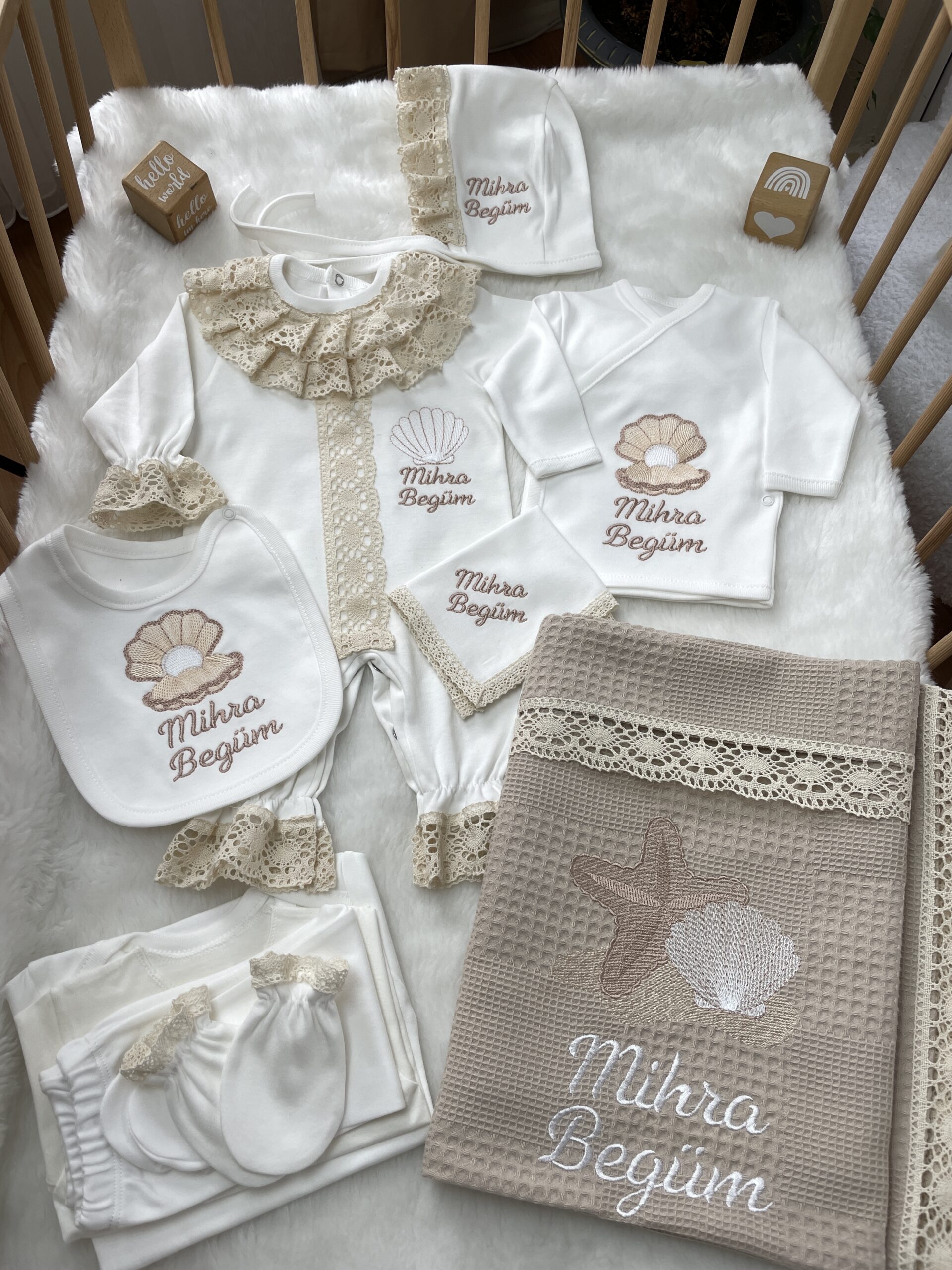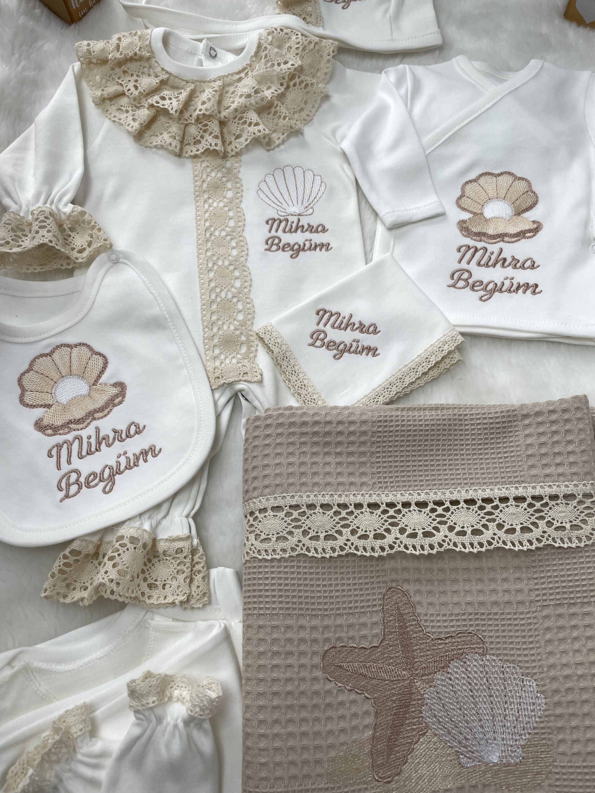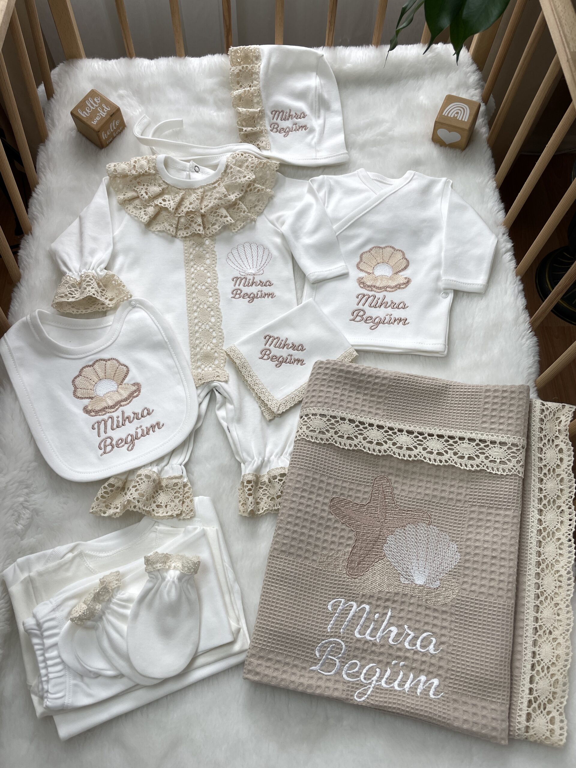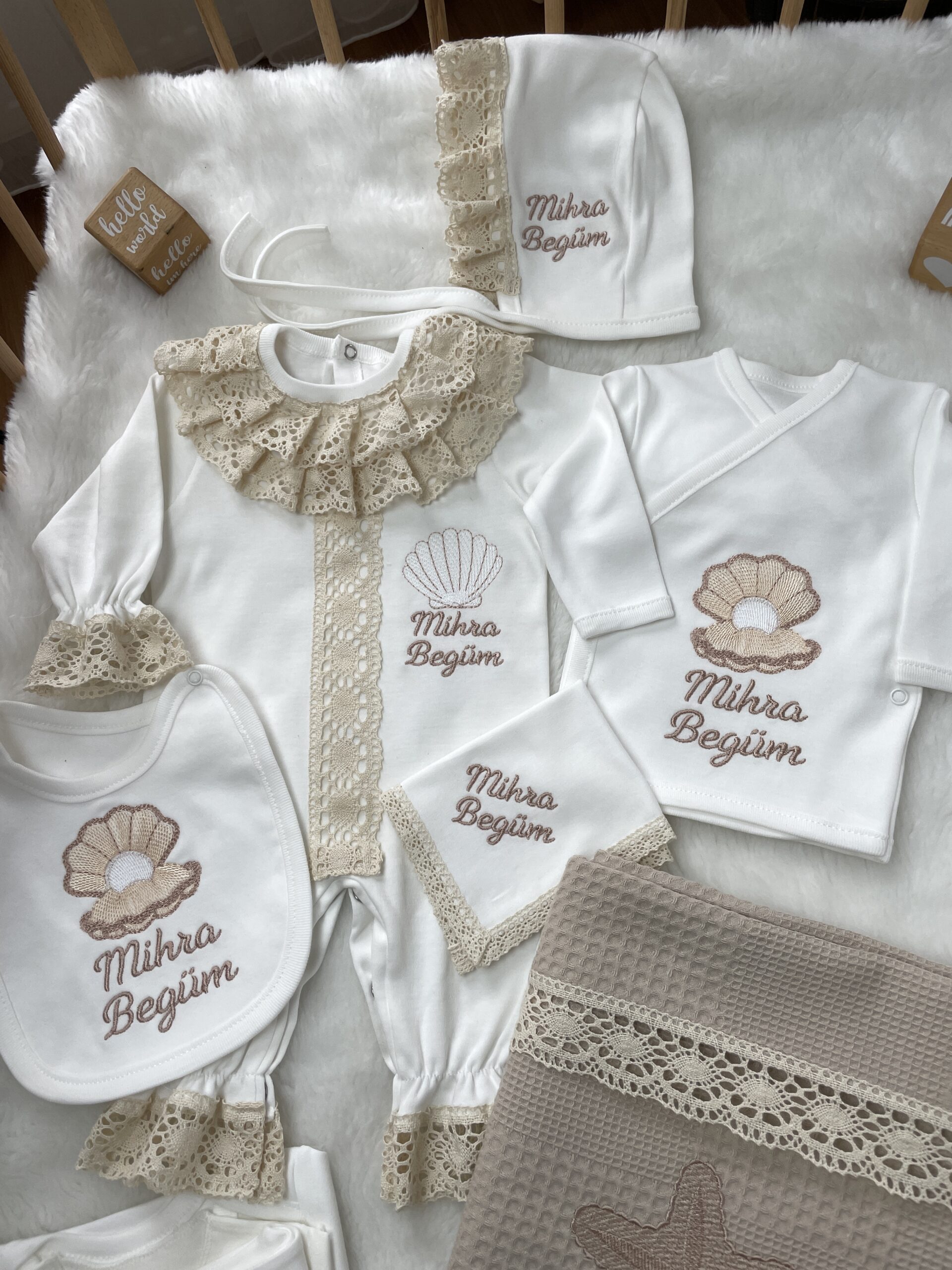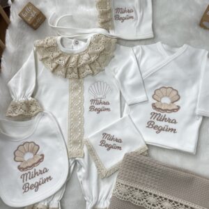Hastane Çıkışı Seti, bebeğinizin ilk günlerinde ihtiyaç duyduğu parçaları bir araya getirir. Konforlu, şık ve kullanıma hazırdır.