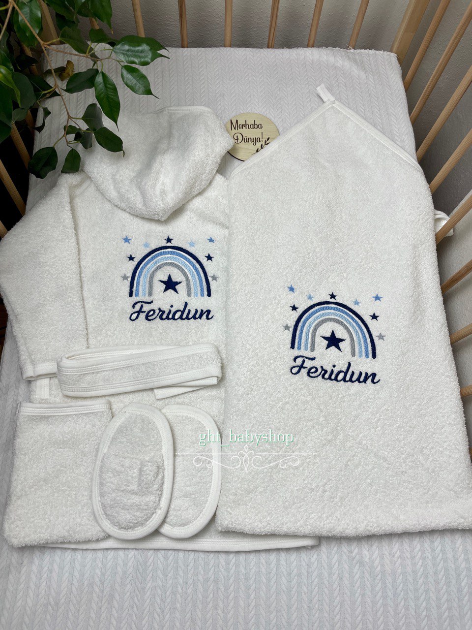 Bebek Bornoz Seti, banyo sonrası bebeğinizi yumuşak dokusuyla sararak sıcak ve konforlu bir kullanım sunar.