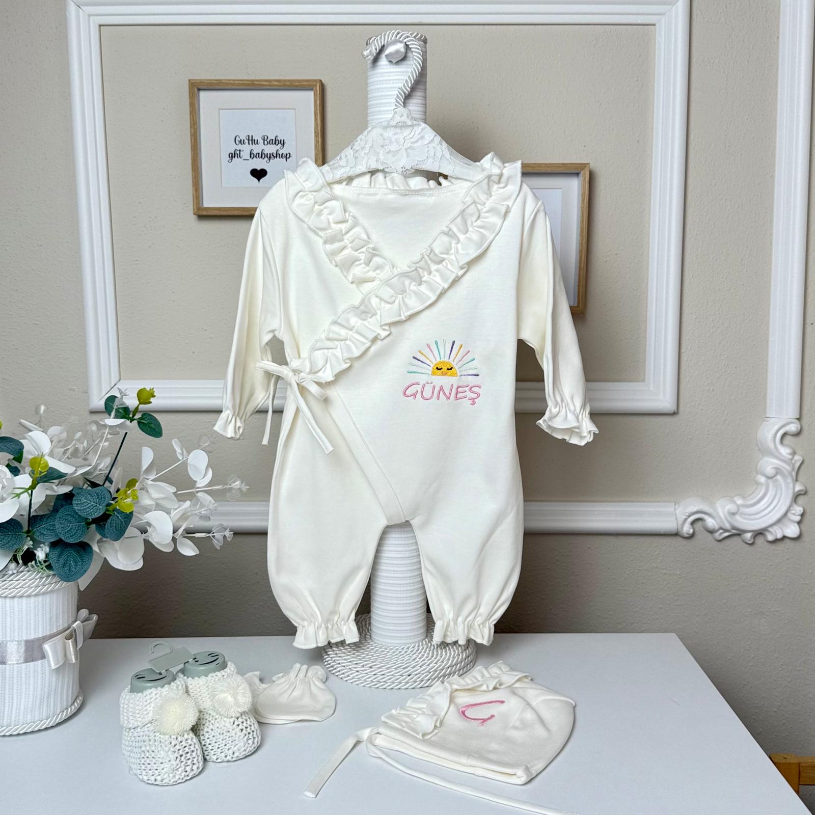 Hastane Çıkışı Seti, bebeğinizin ilk günlerinde ihtiyaç duyduğu parçaları bir araya getirir. Konforlu, şık ve kullanıma hazırdır.