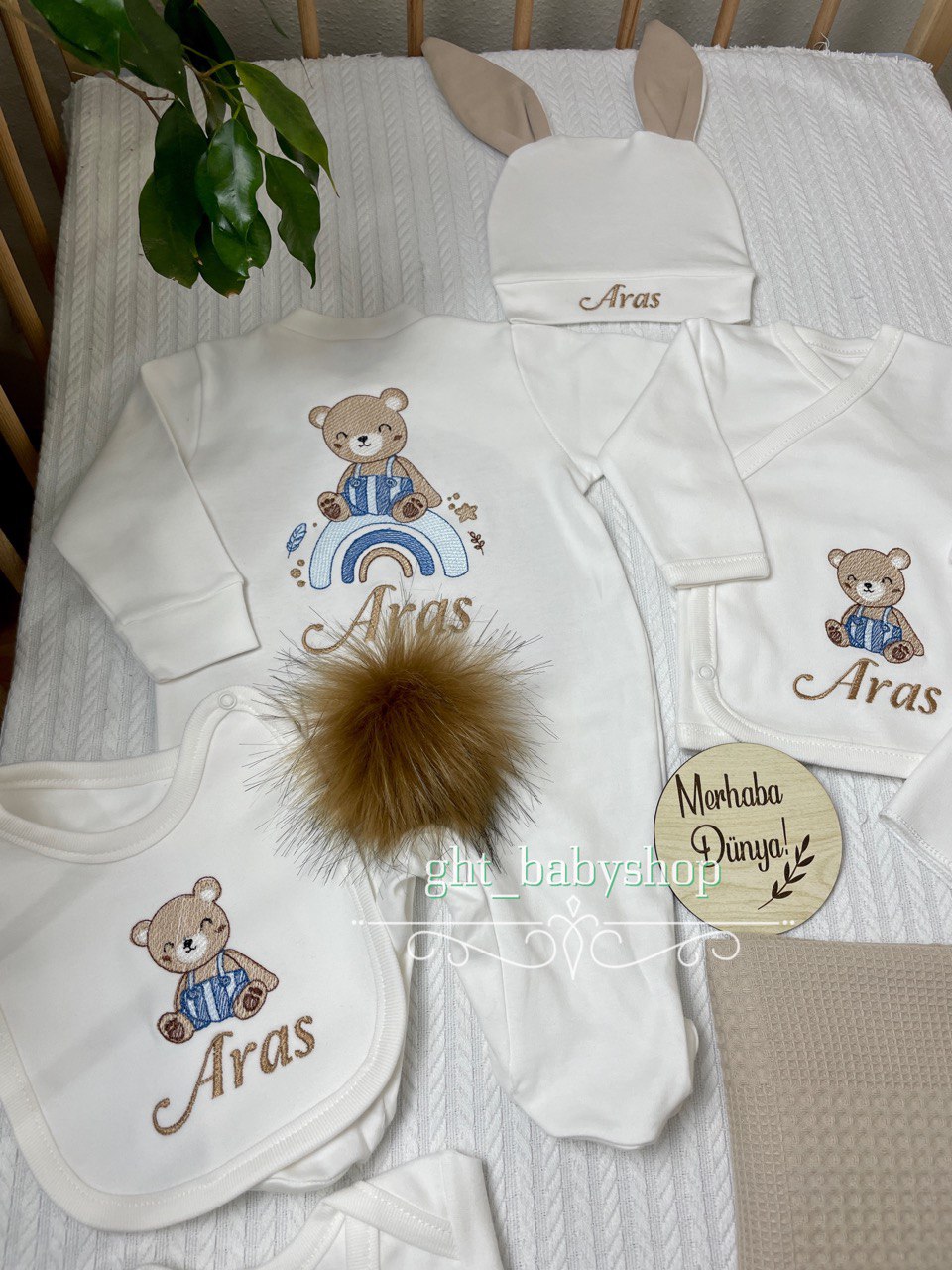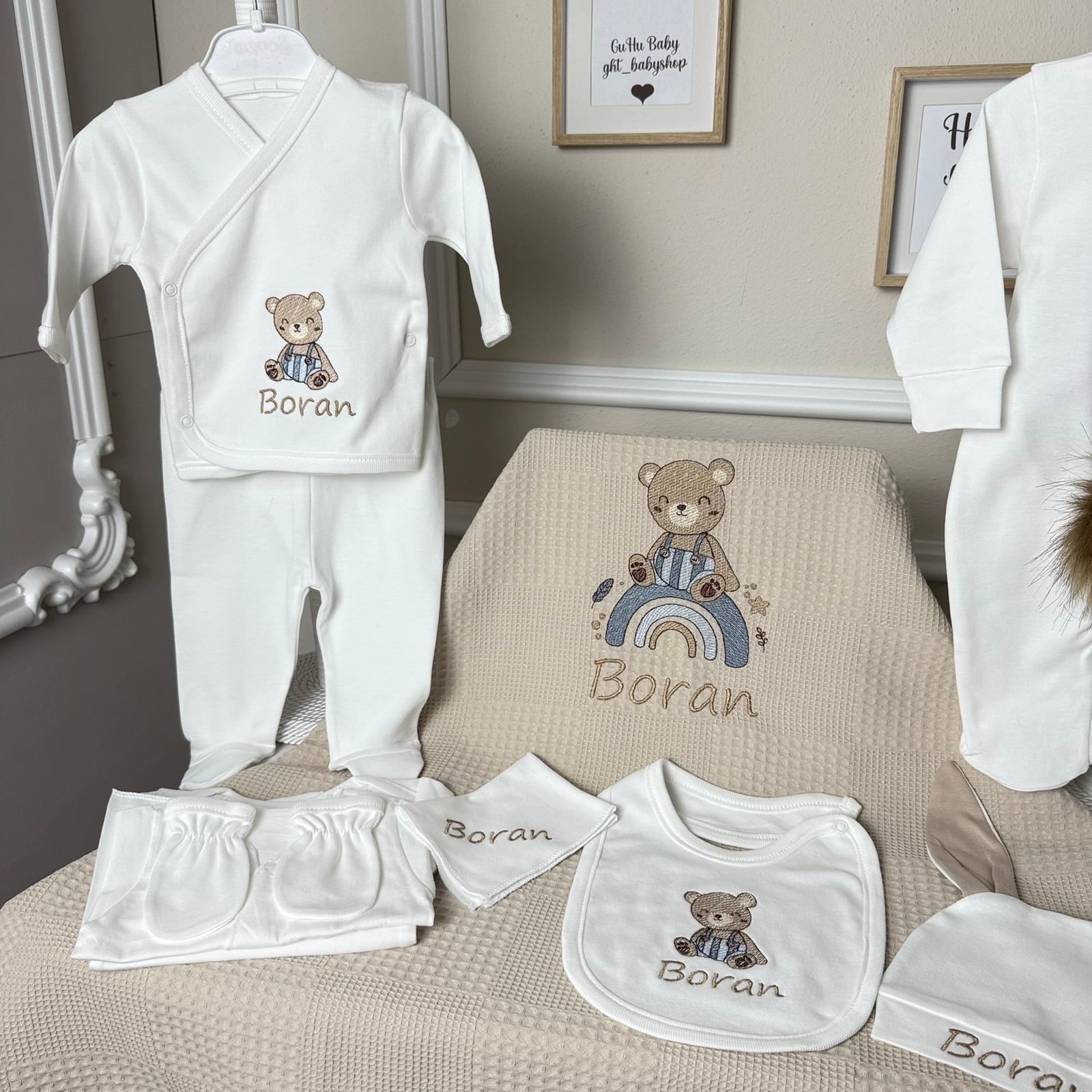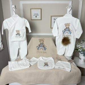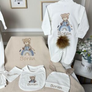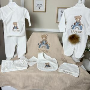 Hastane Çıkışı Seti, bebeğinizin ilk günlerinde ihtiyaç duyduğu parçaları bir araya getirir. Konforlu, şık ve kullanıma hazırdır.