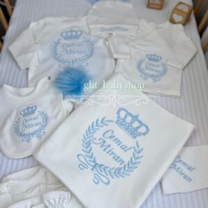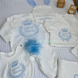 Hastane Çıkışı Seti, bebeğinizin ilk günlerinde ihtiyaç duyduğu parçaları bir araya getirir. Konforlu, şık ve kullanıma hazırdır.