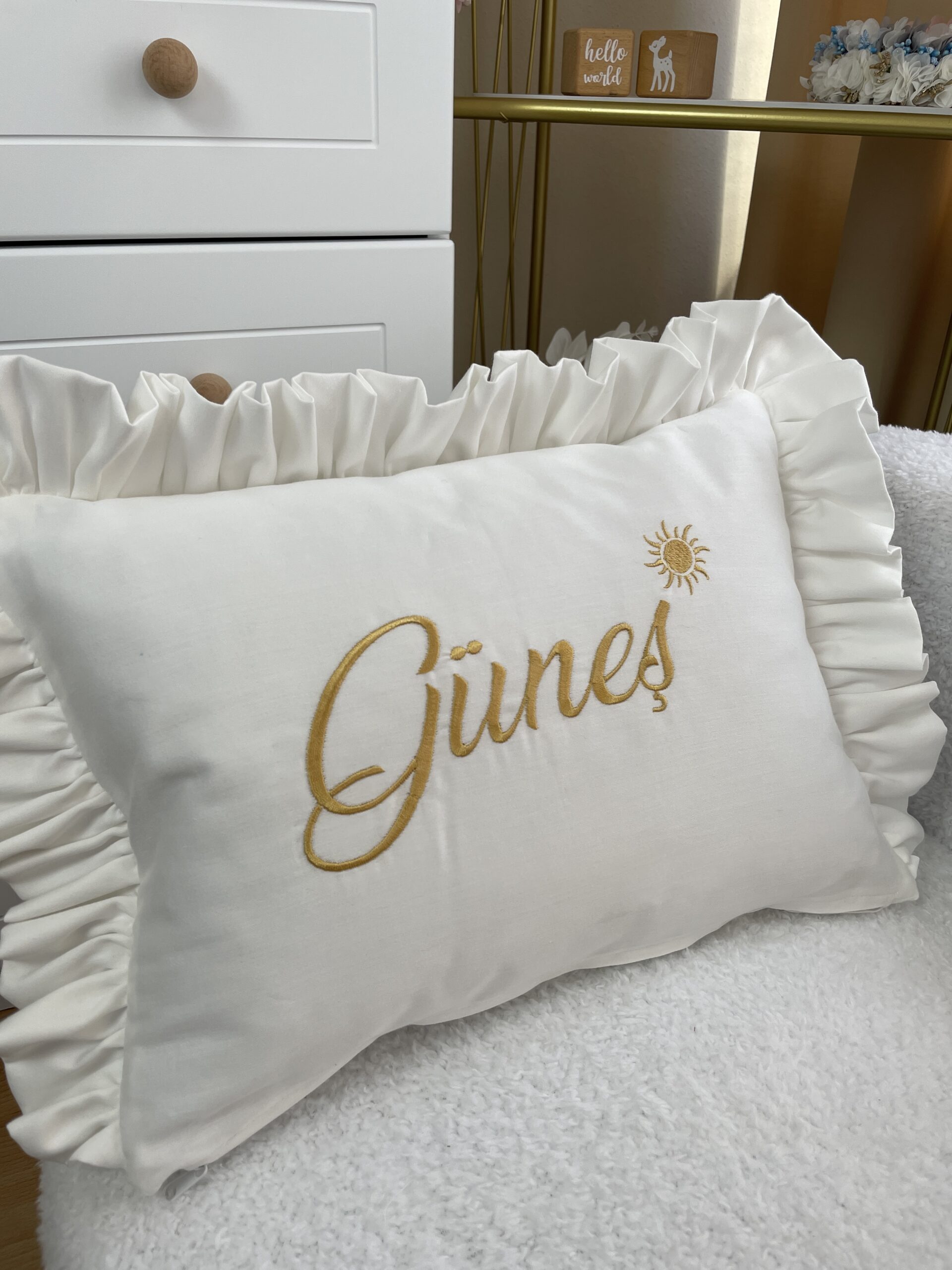 Bebek Takı Yastığı, yumuşak dokusu ve zarif görünümüyle doğum, mevlüt ve hastane çıkışı organizasyonları için ideal bir tamamlayıcıdır.