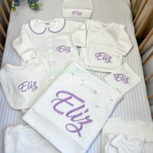 Hastane Çıkışı Seti, bebeğinizin ilk günlerinde ihtiyaç duyduğu parçaları bir araya getirir. Konforlu, şık ve kullanıma hazırdır.
