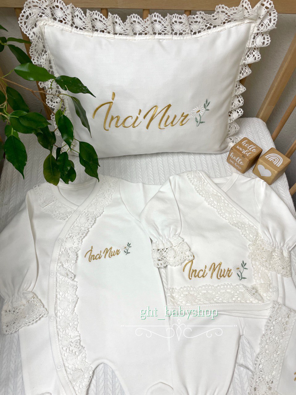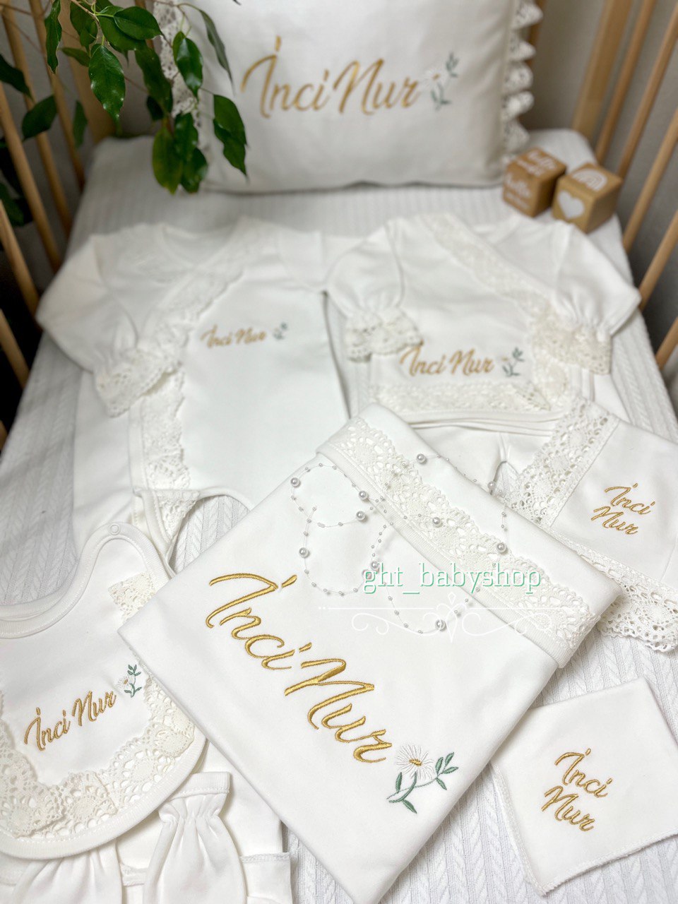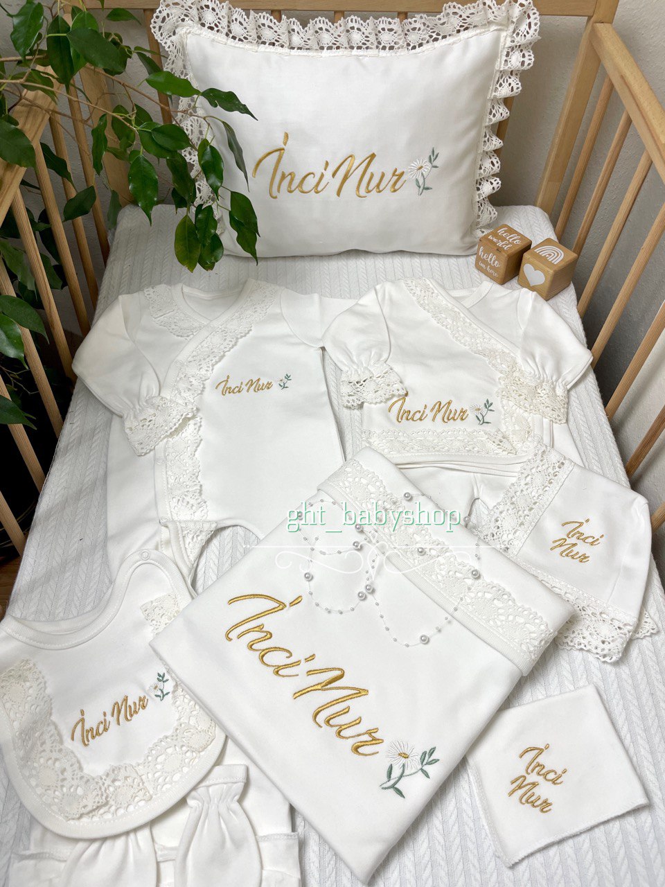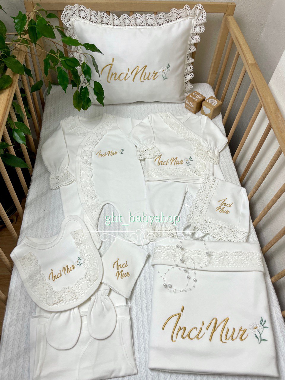Hastane Çıkışı Seti, bebeğinizin ilk günlerinde ihtiyaç duyduğu parçaları bir araya getirir. Konforlu, şık ve kullanıma hazırdır.