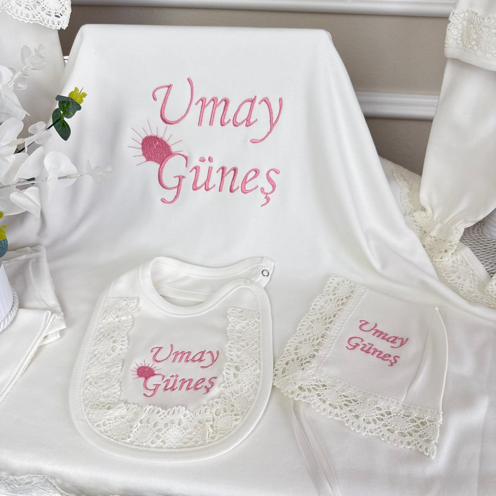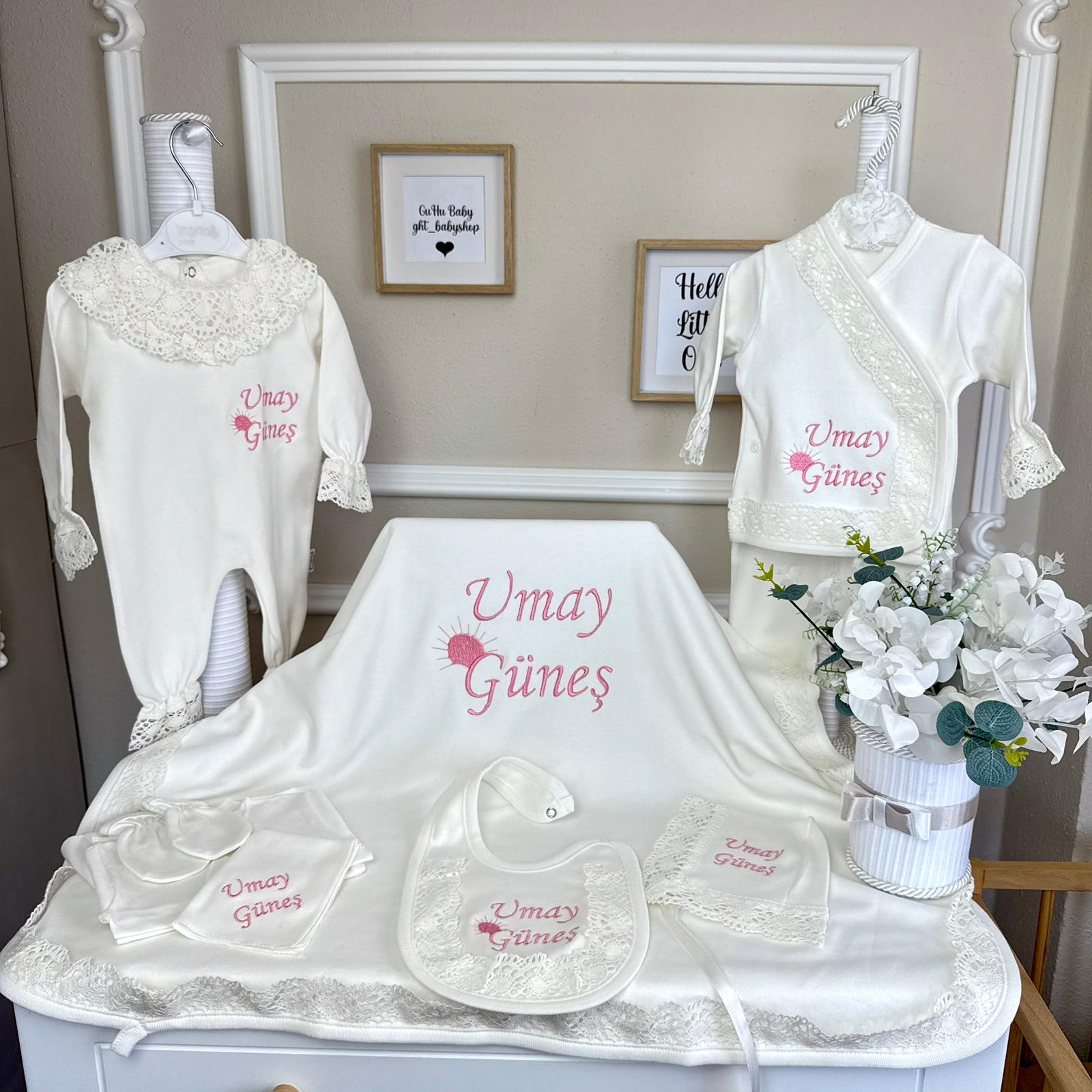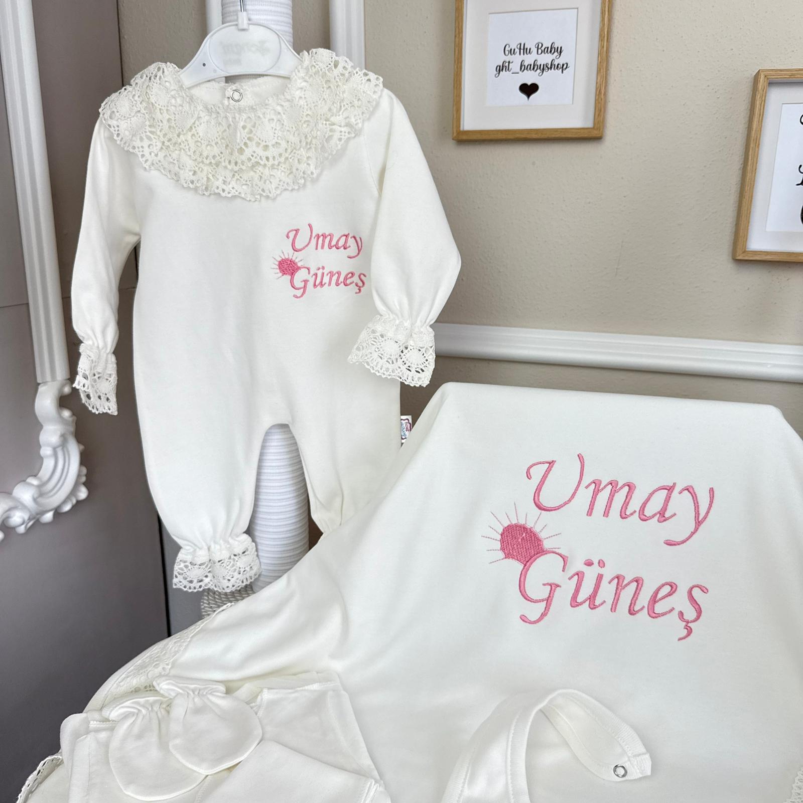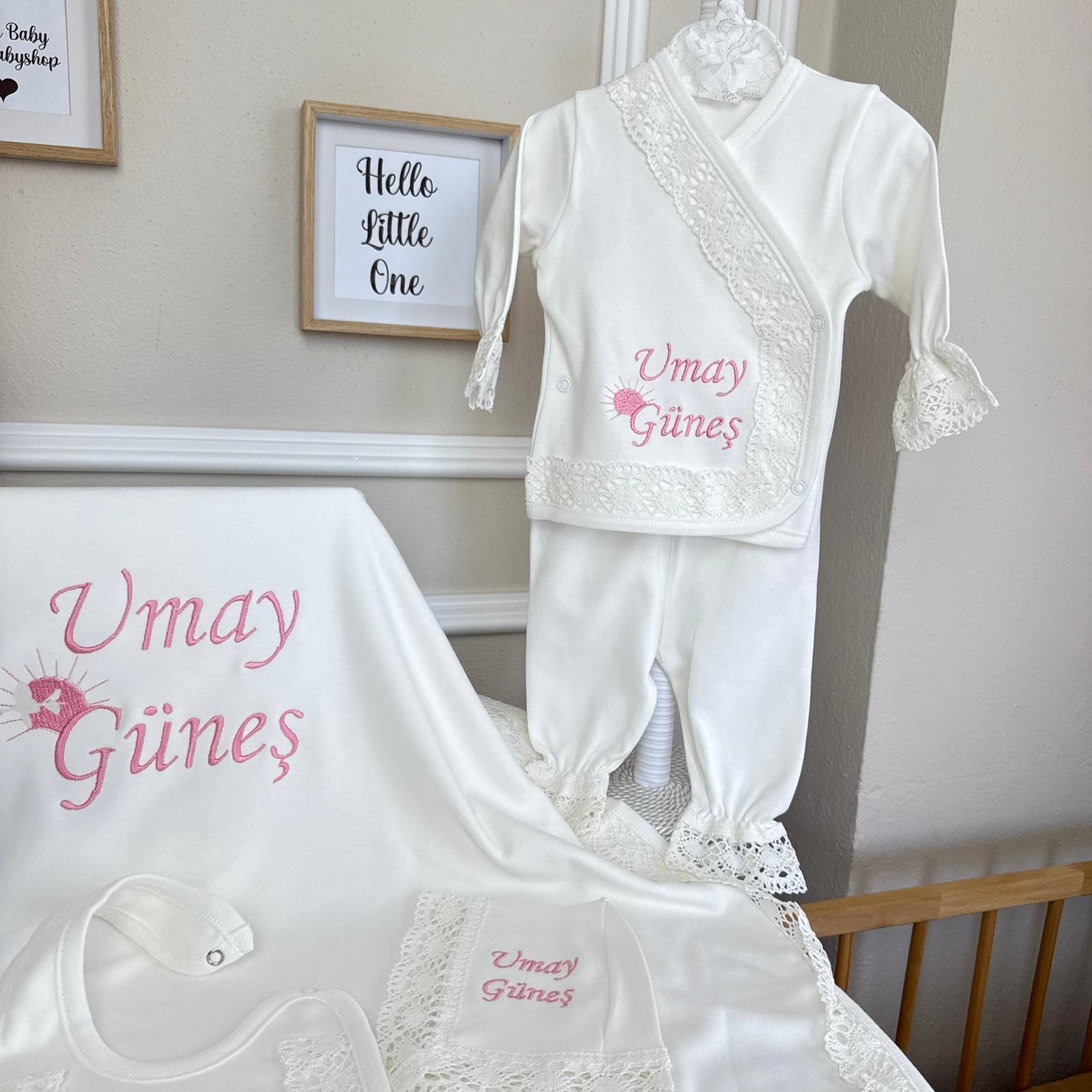 Hastane Çıkışı Seti, bebeğinizin ilk günlerinde ihtiyaç duyduğu parçaları bir araya getirir. Konforlu, şık ve kullanıma hazırdır.