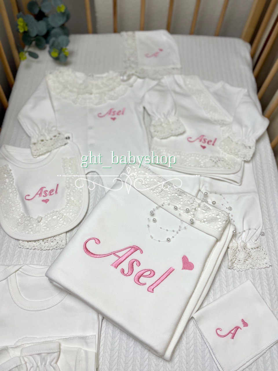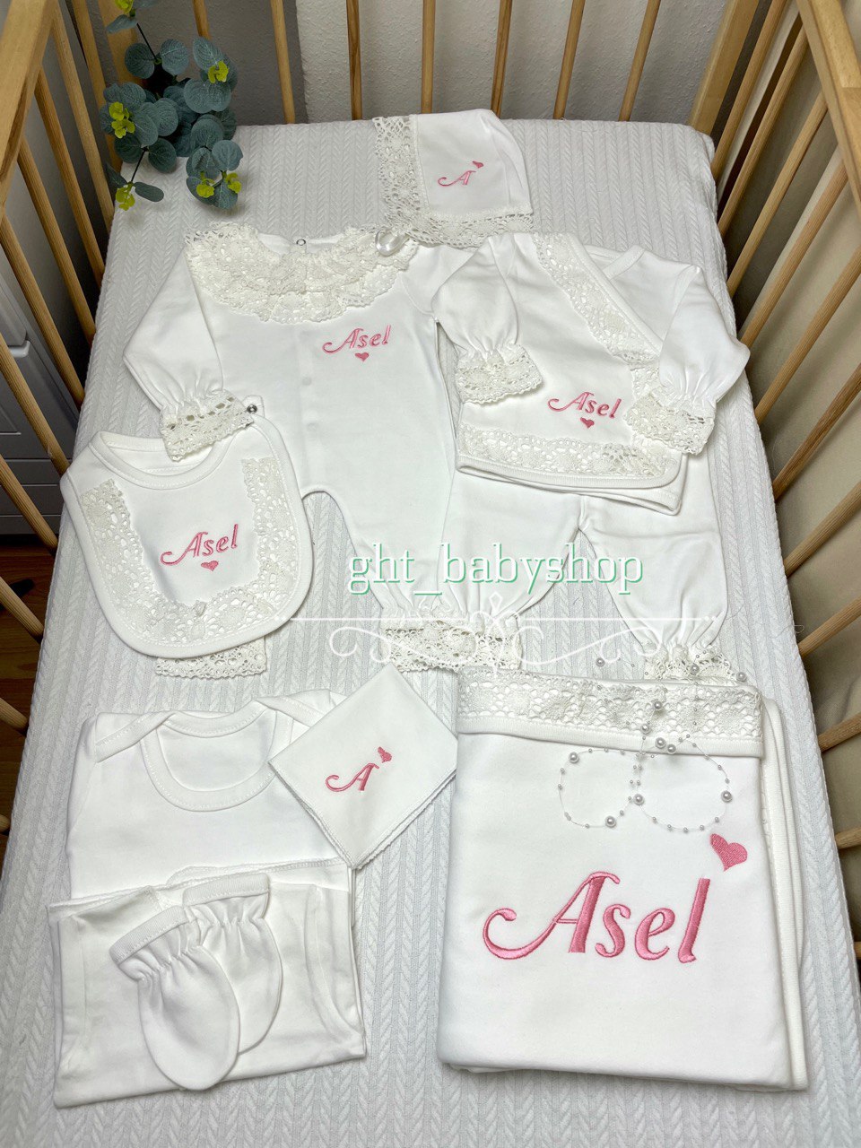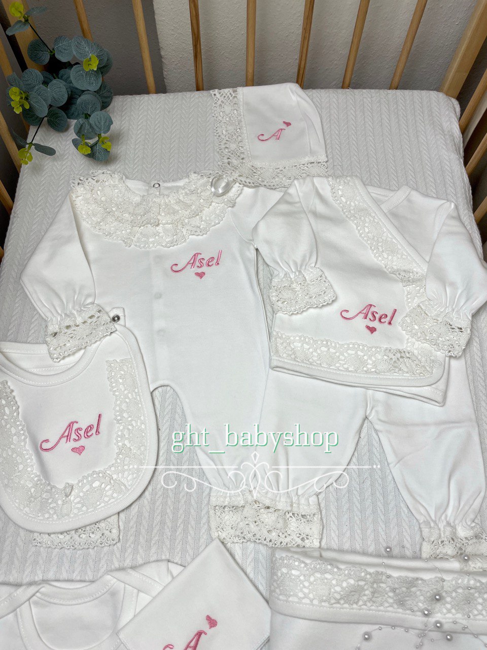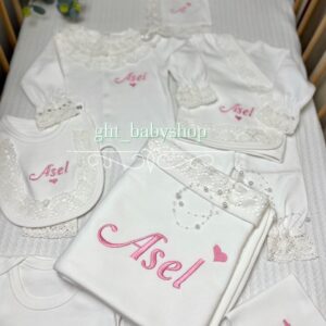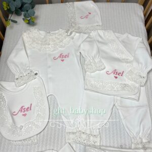 Hastane Çıkışı Seti, bebeğinizin ilk günlerinde ihtiyaç duyduğu parçaları bir araya getirir. Konforlu, şık ve kullanıma hazırdır.