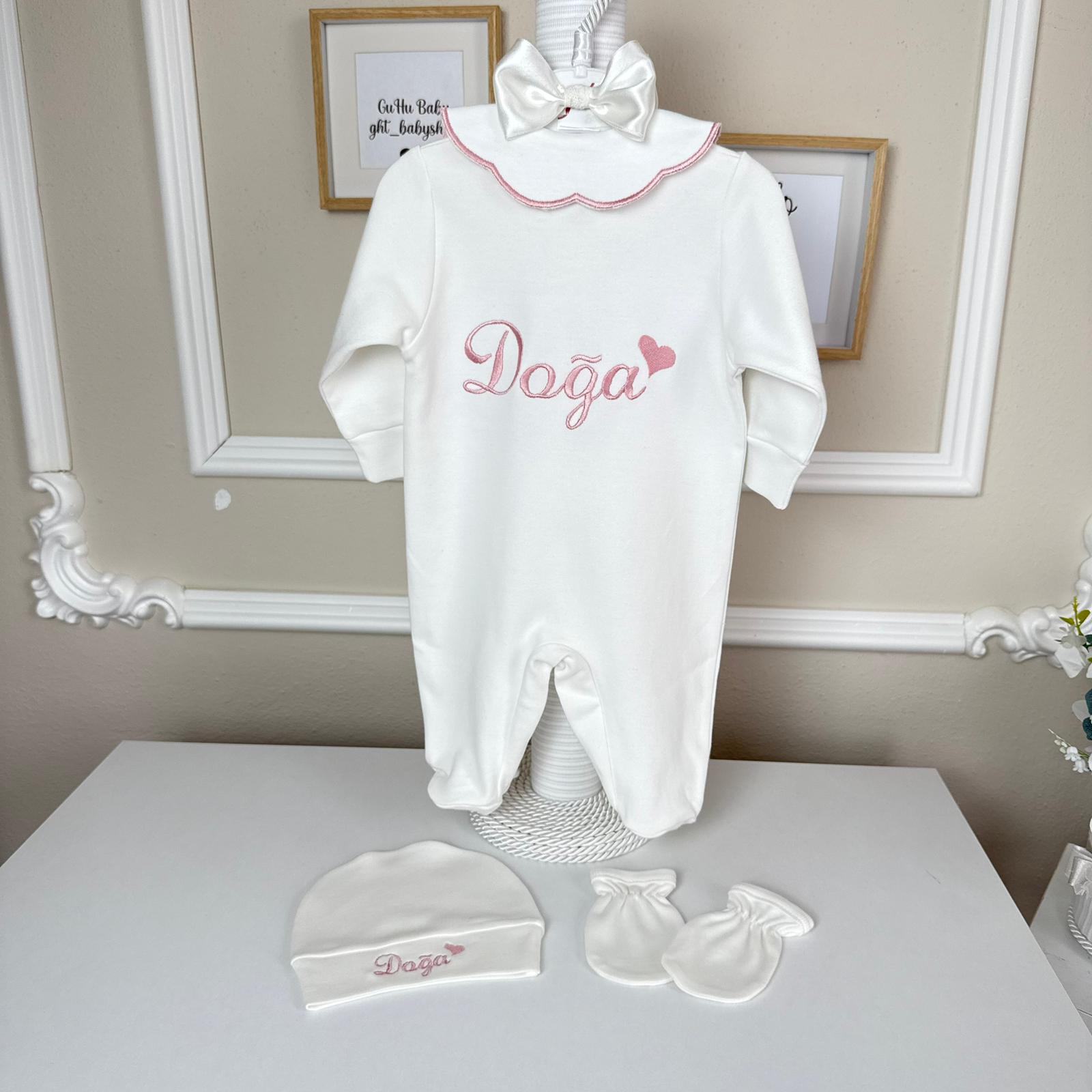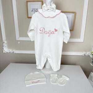 Hastane Çıkışı Seti, bebeğinizin ilk günlerinde ihtiyaç duyduğu parçaları bir araya getirir. Konforlu, şık ve kullanıma hazırdır.