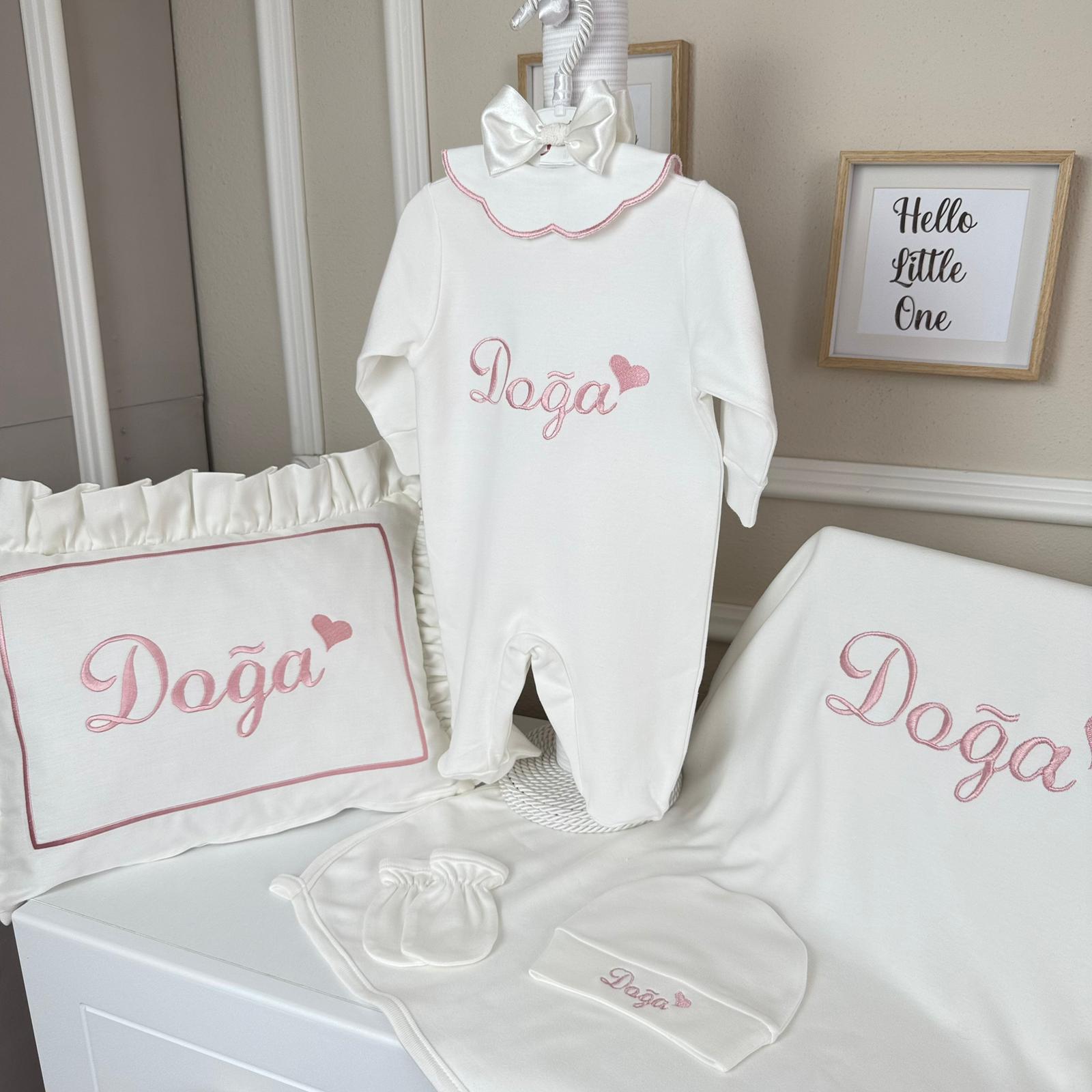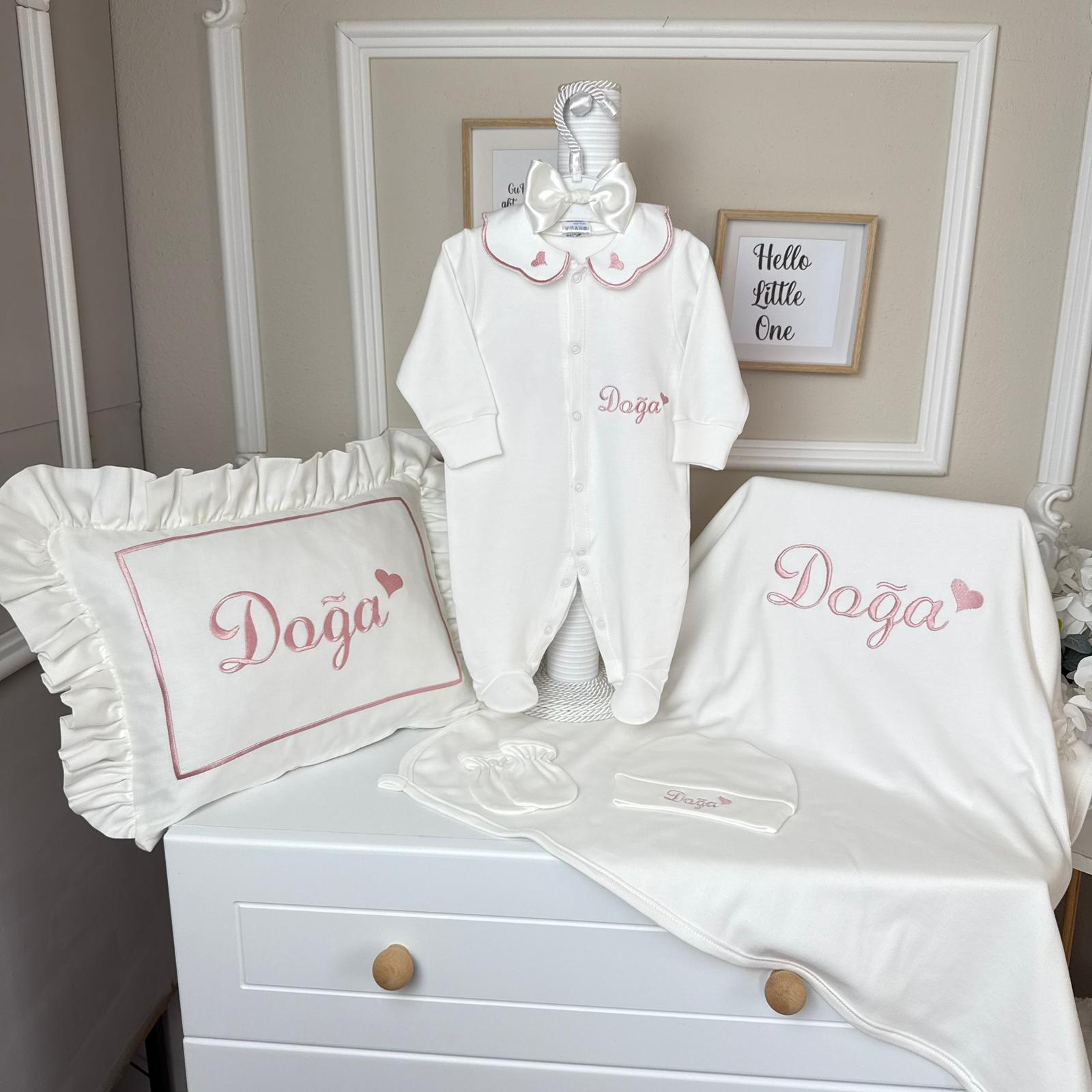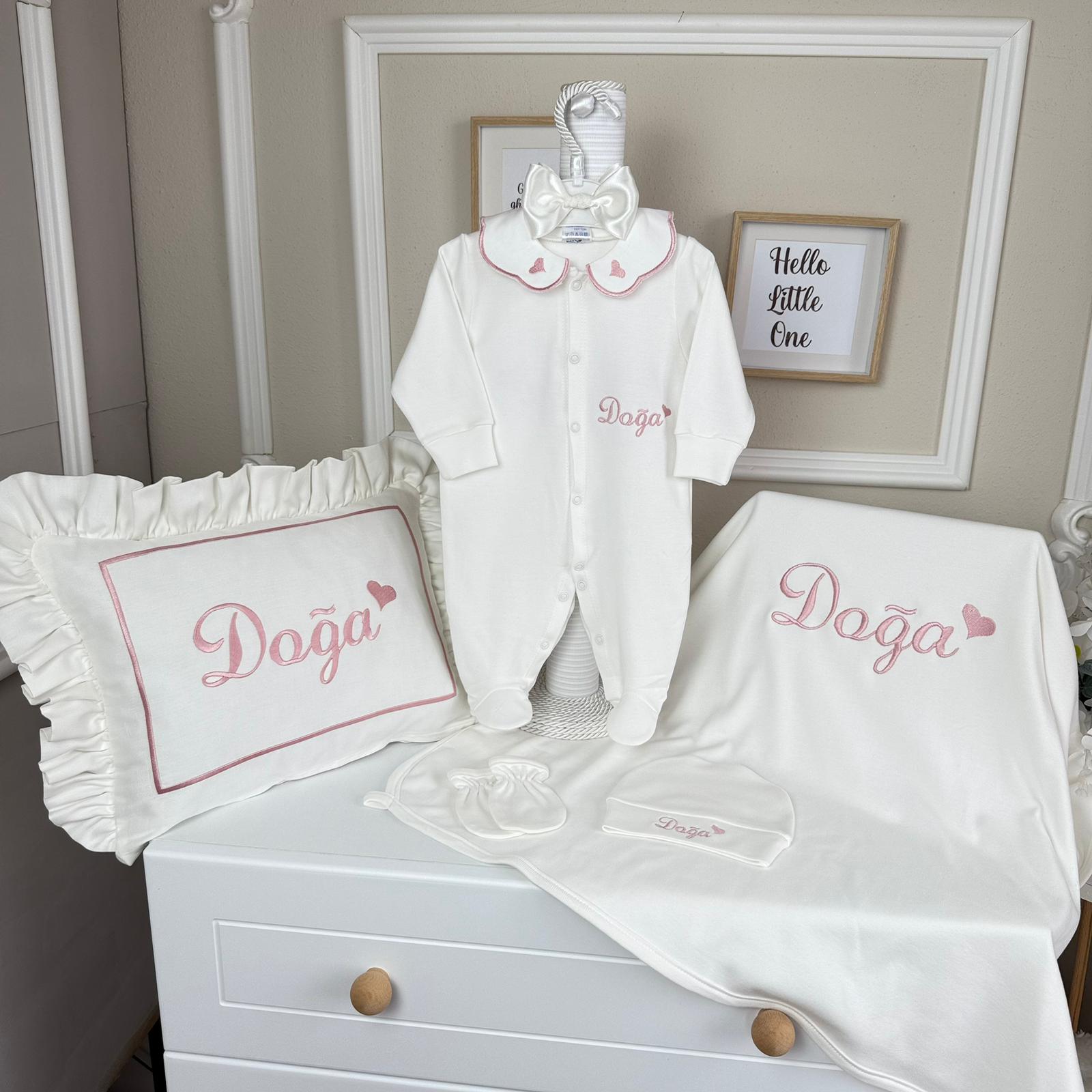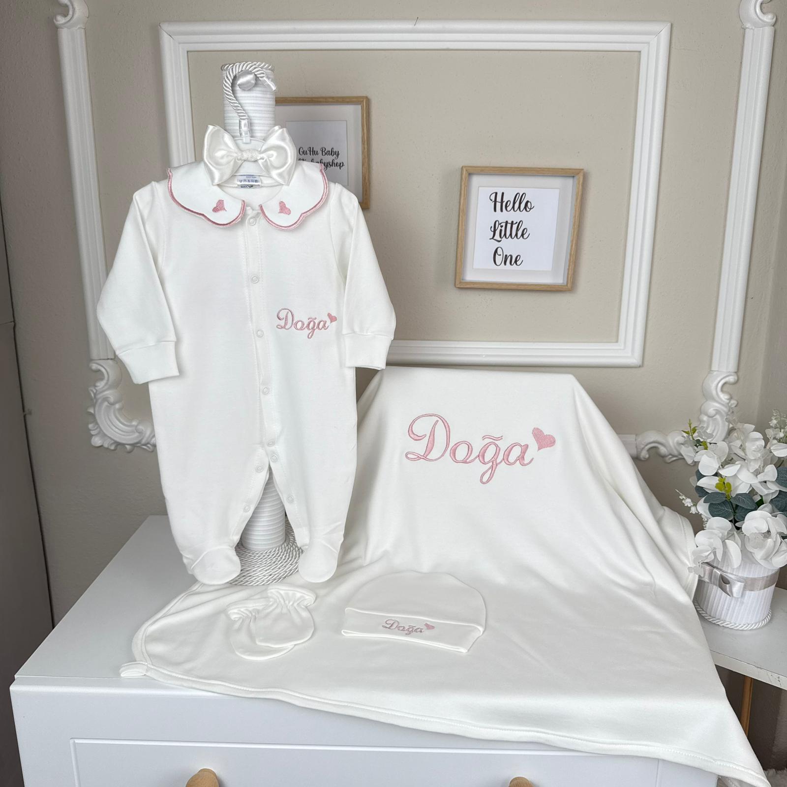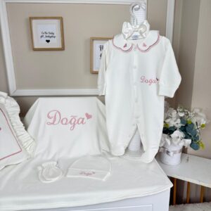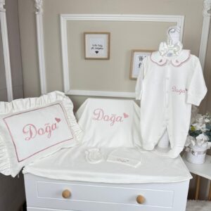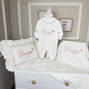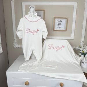 Hastane Çıkışı Seti, bebeğinizin ilk günlerinde ihtiyaç duyduğu parçaları bir araya getirir. Konforlu, şık ve kullanıma hazırdır.