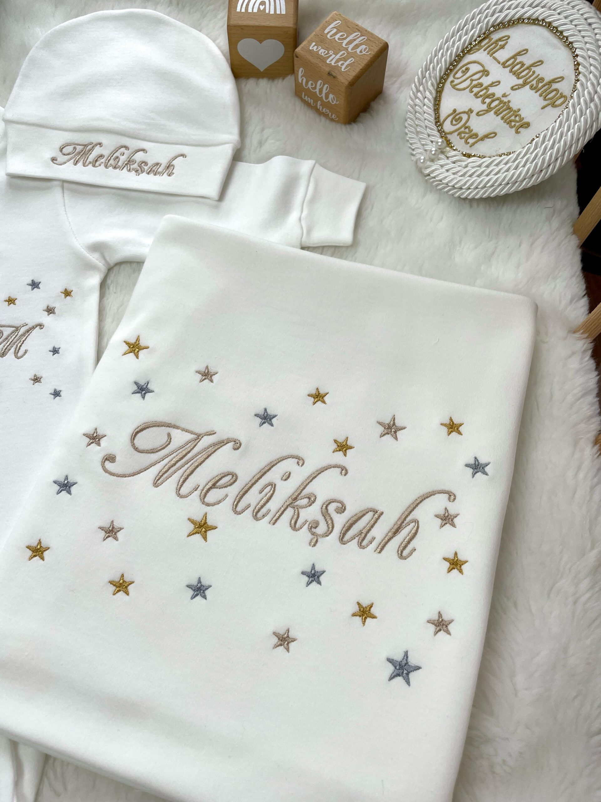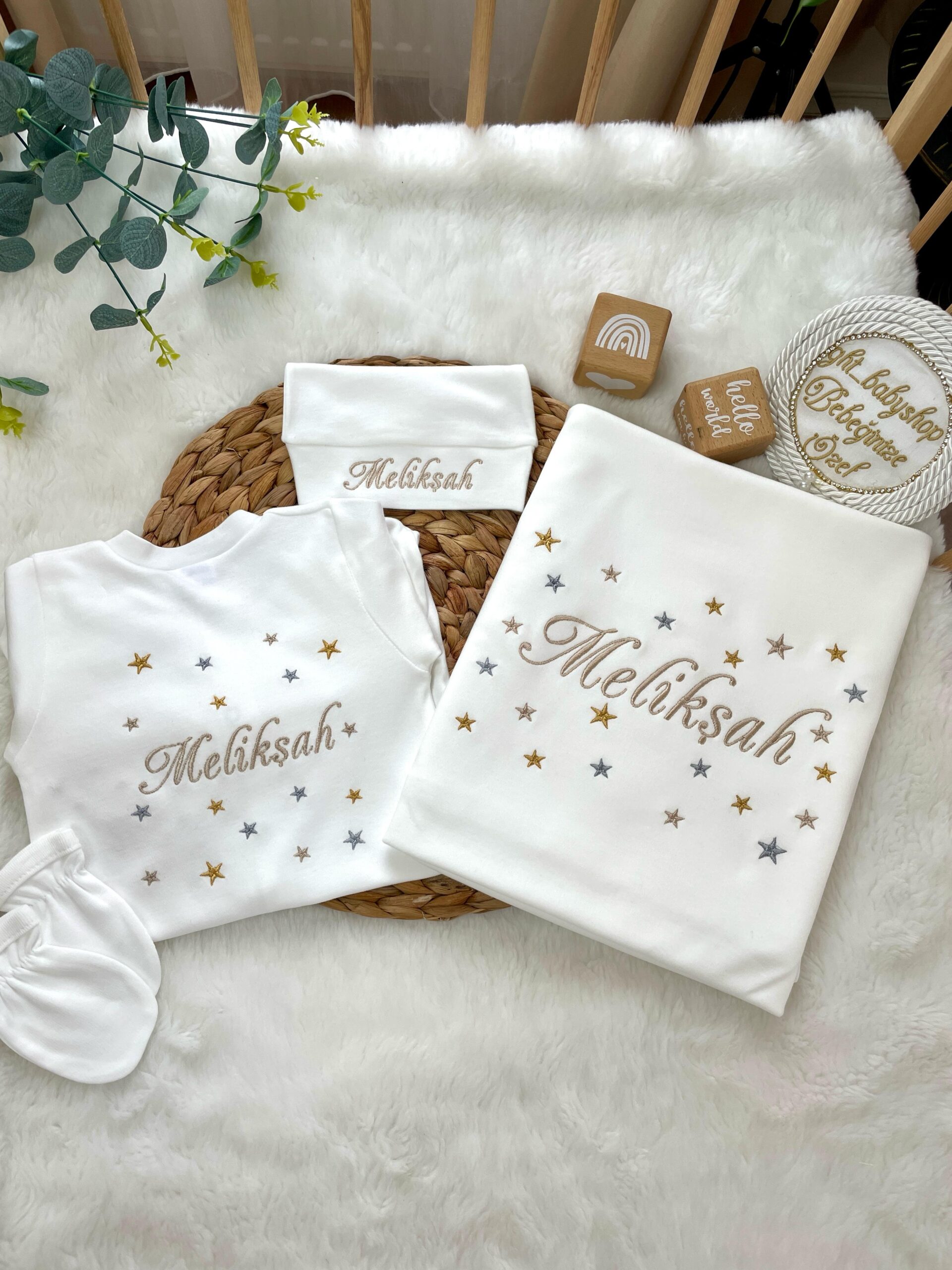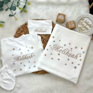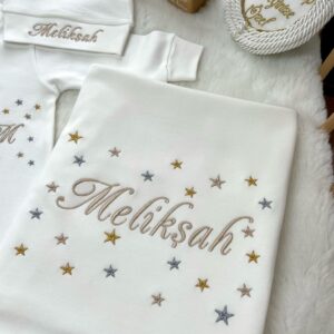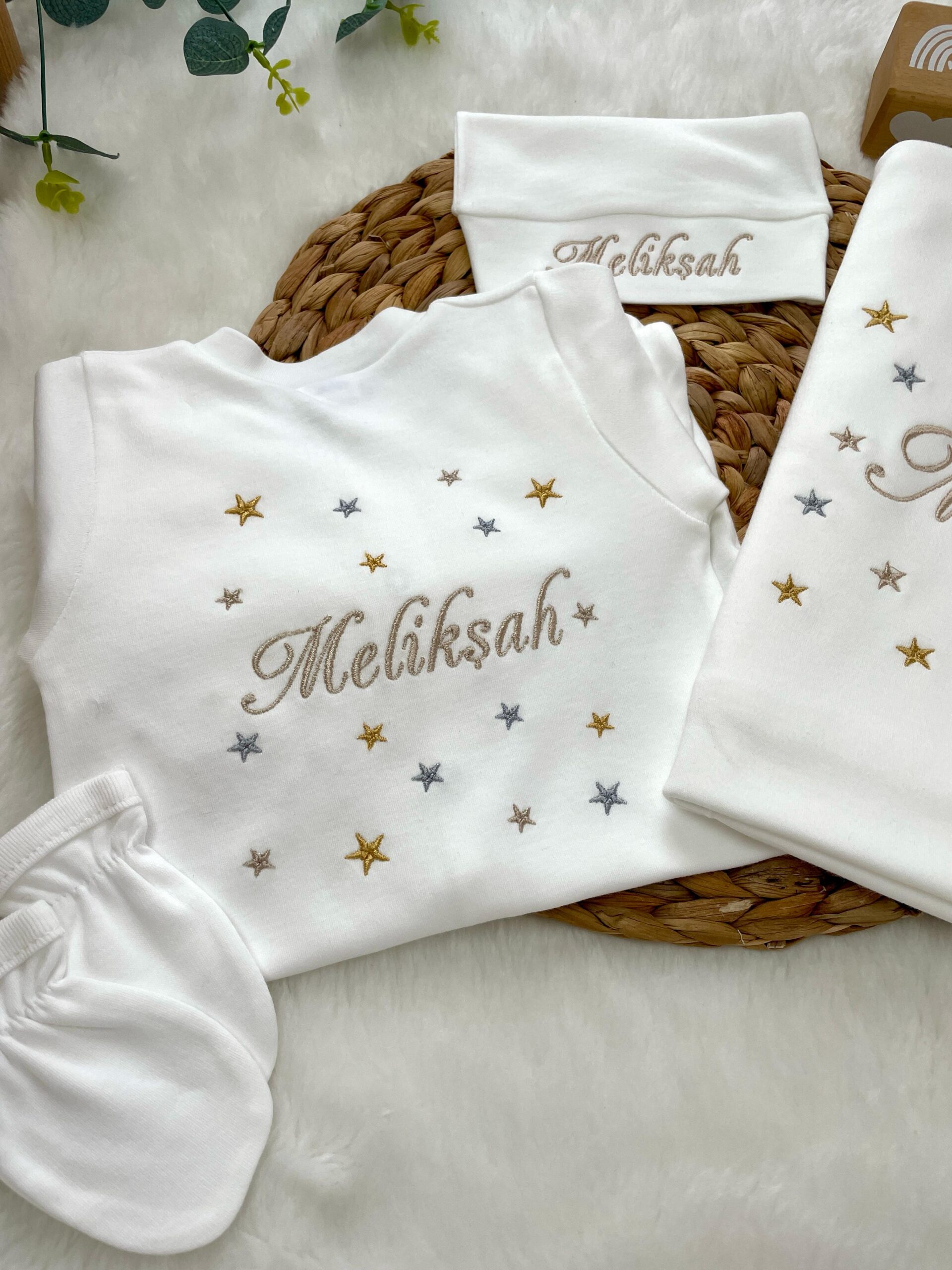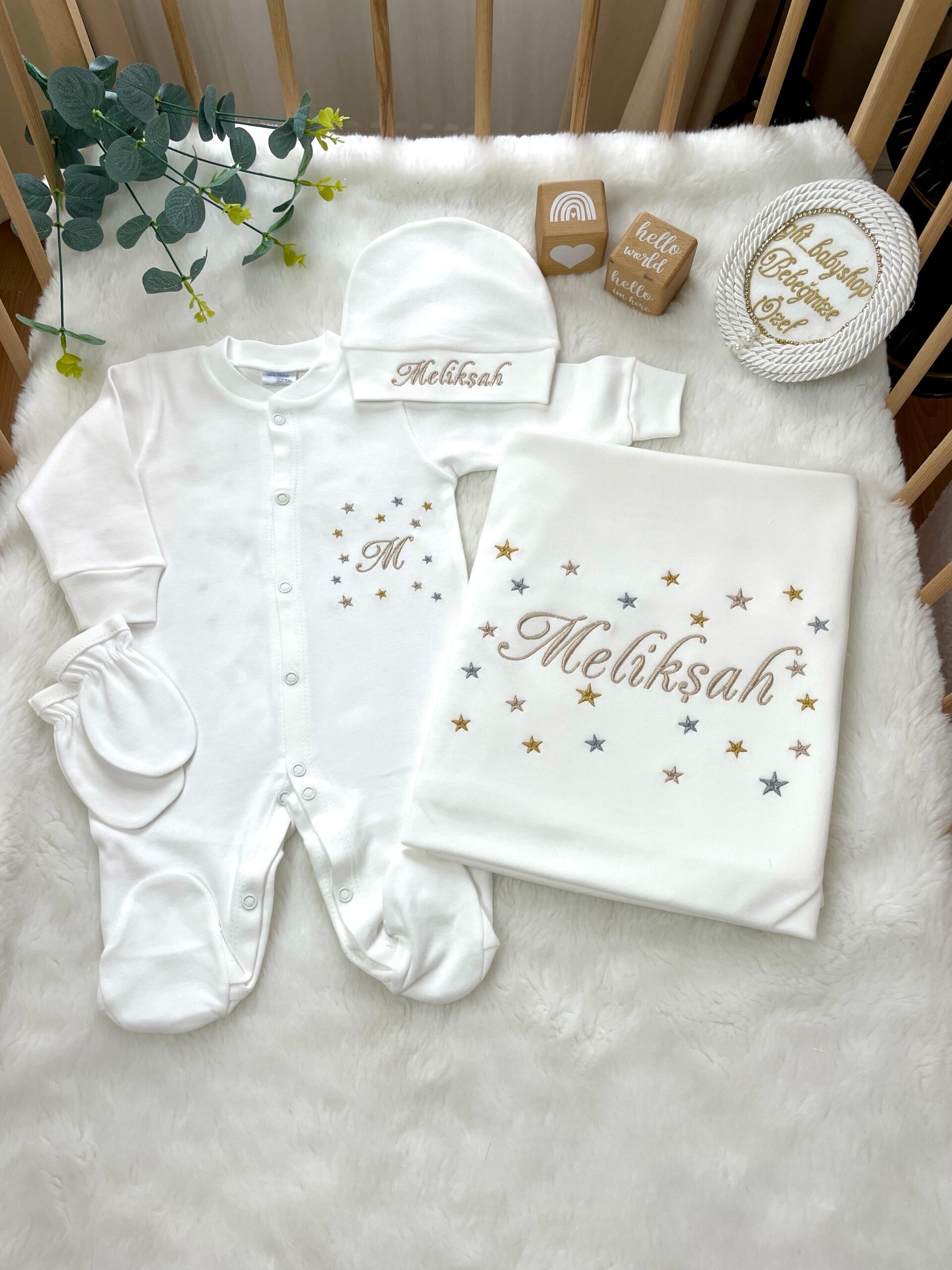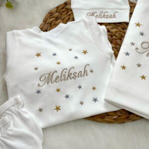 Hastane Çıkışı Seti, bebeğinizin ilk günlerinde ihtiyaç duyduğu parçaları bir araya getirir. Konforlu, şık ve kullanıma hazırdır.