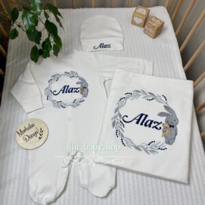 Hastane Çıkışı Seti, bebeğinizin ilk günlerinde ihtiyaç duyduğu parçaları bir araya getirir. Konforlu, şık ve kullanıma hazırdır.