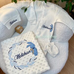 Hastane Çıkışı Seti, bebeğinizin ilk günlerinde ihtiyaç duyduğu parçaları bir araya getirir. Konforlu, şık ve kullanıma hazırdır.