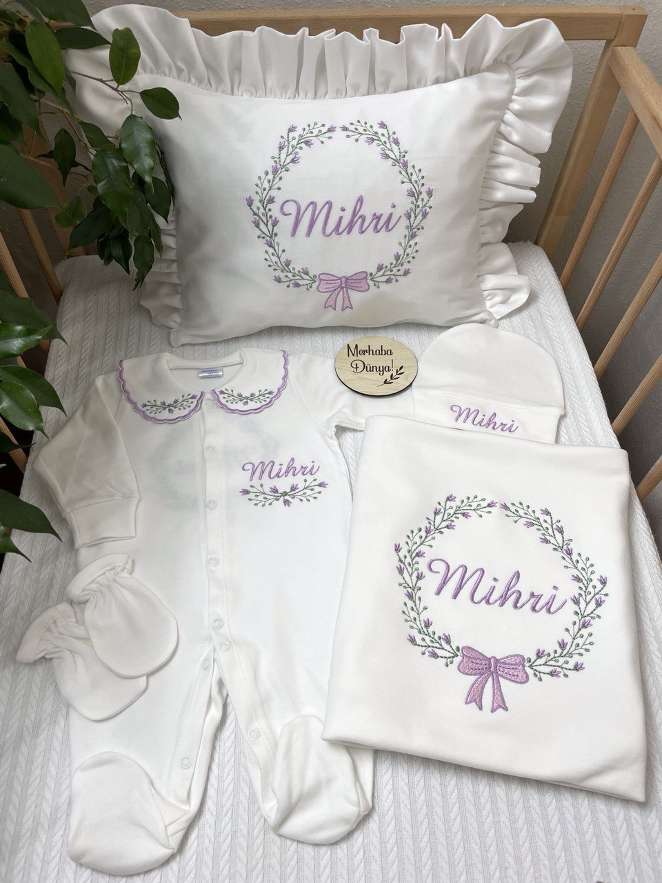 Hastane Çıkışı Seti, bebeğinizin ilk günlerinde ihtiyaç duyduğu parçaları bir araya getirir. Konforlu, şık ve kullanıma hazırdır.