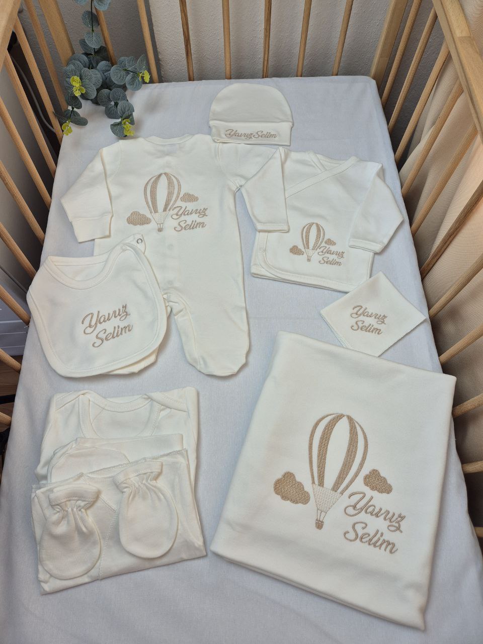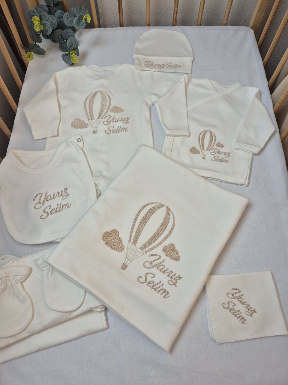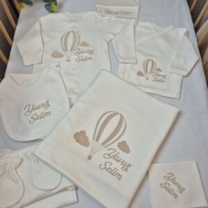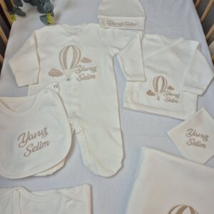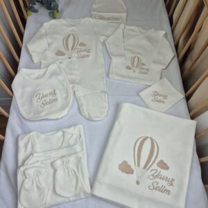 Hastane Çıkışı Seti, bebeğinizin ilk günlerinde ihtiyaç duyduğu parçaları bir araya getirir. Konforlu, şık ve kullanıma hazırdır.