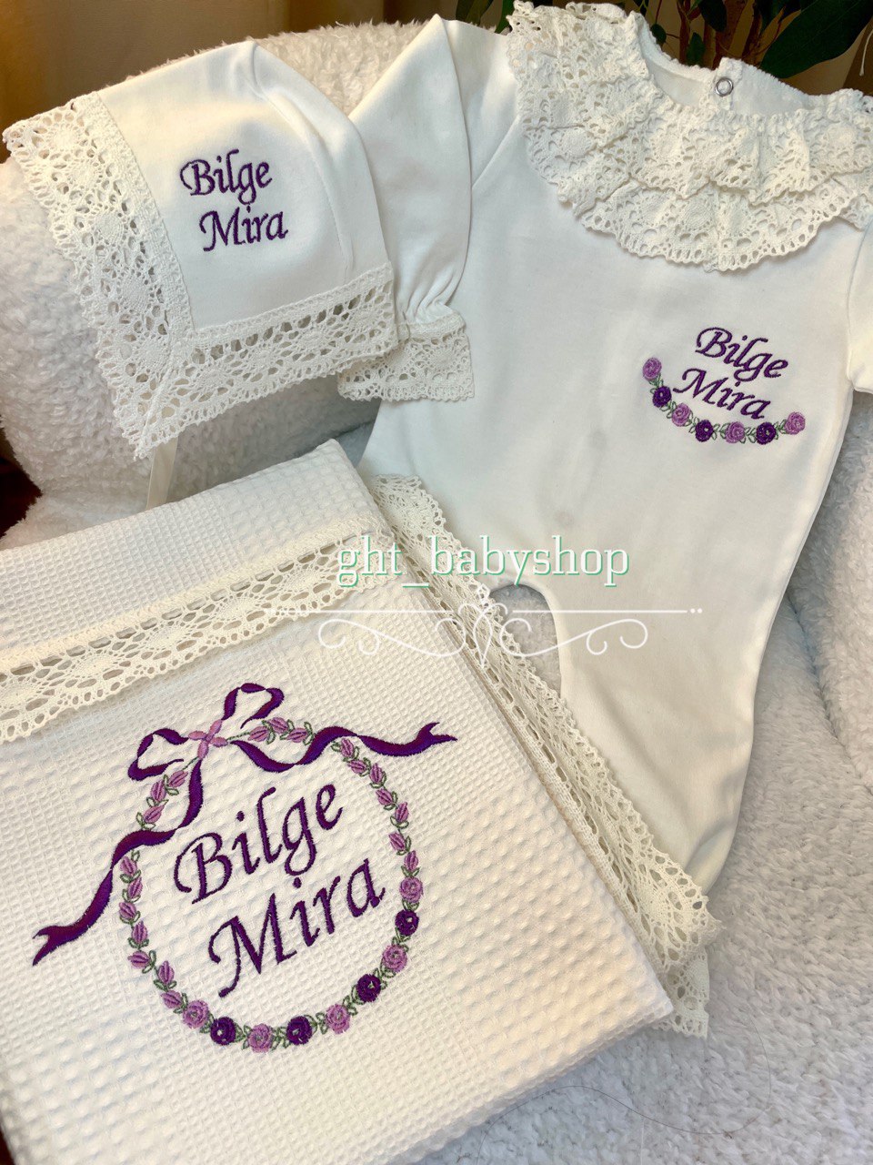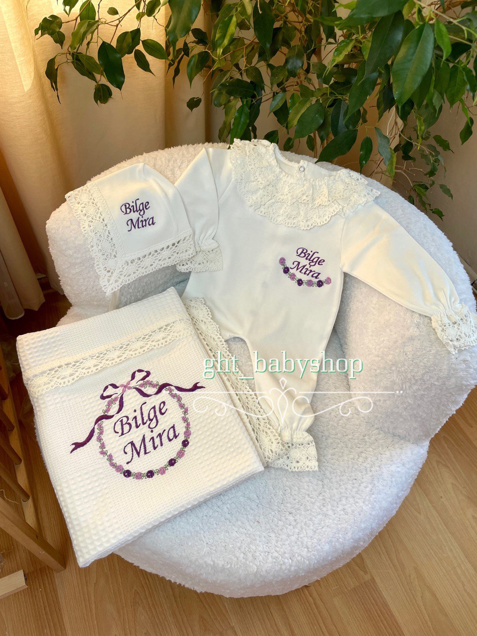Hastane Çıkışı Seti, bebeğinizin ilk günlerinde ihtiyaç duyduğu parçaları bir araya getirir. Konforlu, şık ve kullanıma hazırdır.